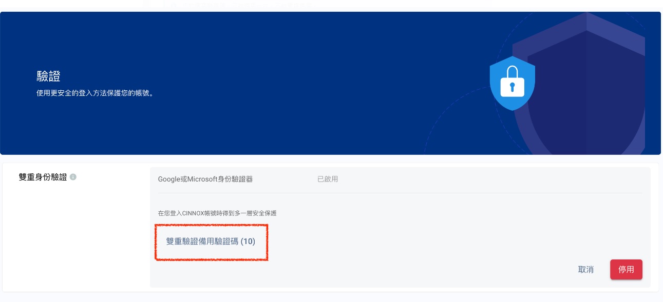 當您啟用雙重身份驗證時,CINNOX 會自動發出十個備用驗證碼。當您未能使用流動裝置和身份驗證應用程式時,您可以使用這些備用驗證碼來驗證您的帳號。請保存這些備用驗證碼副本,將其保存到安全地方。
