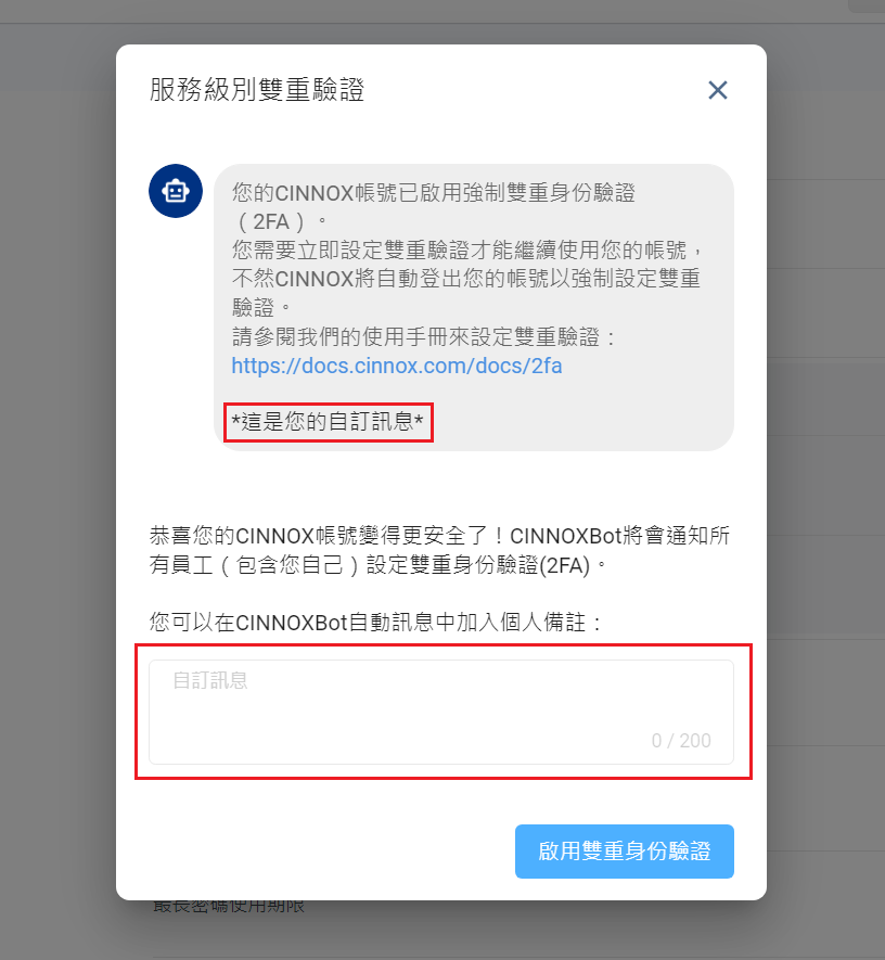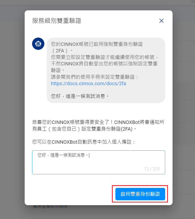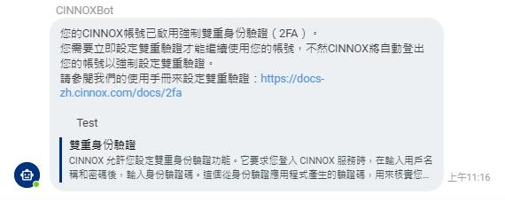 - 啟用服務級別雙重身份驗證功能後,員工會從CINNOXBot訊息中,收到系統發送到電郵、控制面板以及應用程式的訊息。