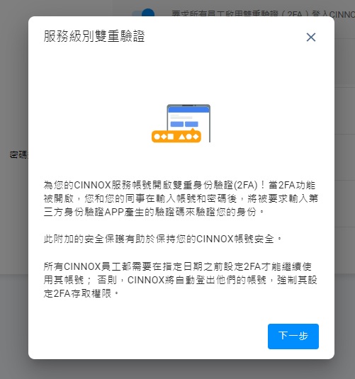在CINNOX 設定服務級別雙重身份驗證功能後,所有員工需要在其帳號同樣設定此功能。如果員工在服務級別雙重身份驗證功能執行後,未能在其帳號設定此功能的話,他們將自動退出服務,以便設定此功能。