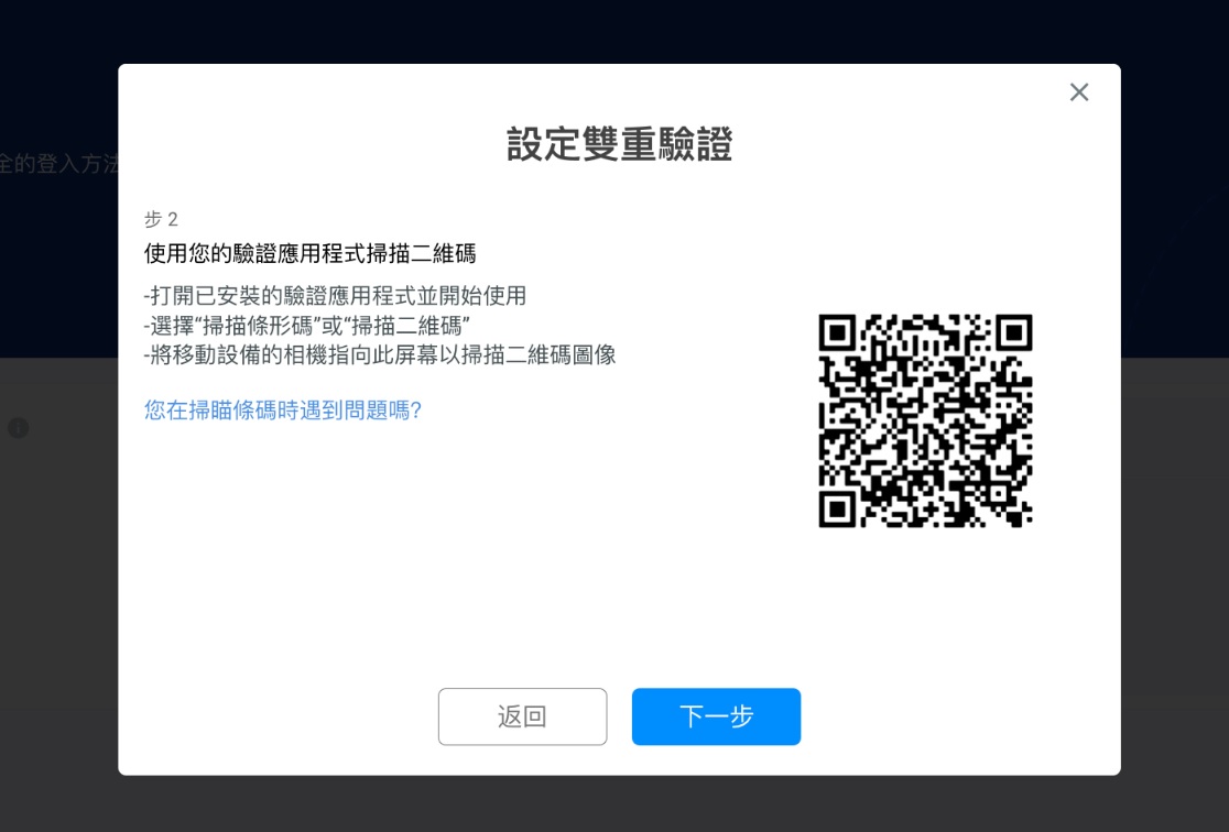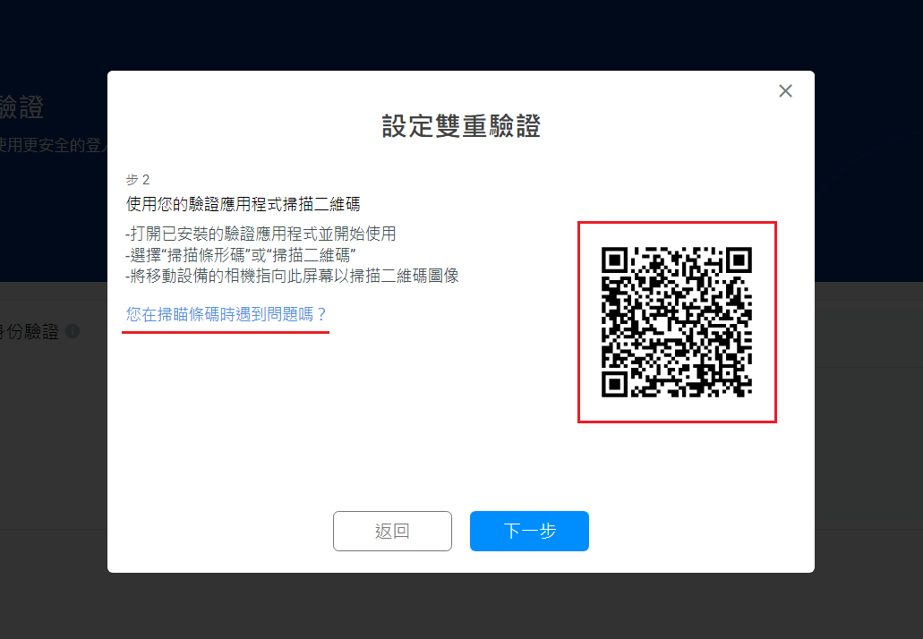 - 或者,如果在掃描條碼時遇到問題,請點擊「您在掃描條碼時遇到問題嗎?」,並按照手動發出驗證碼的說明,進行操作。