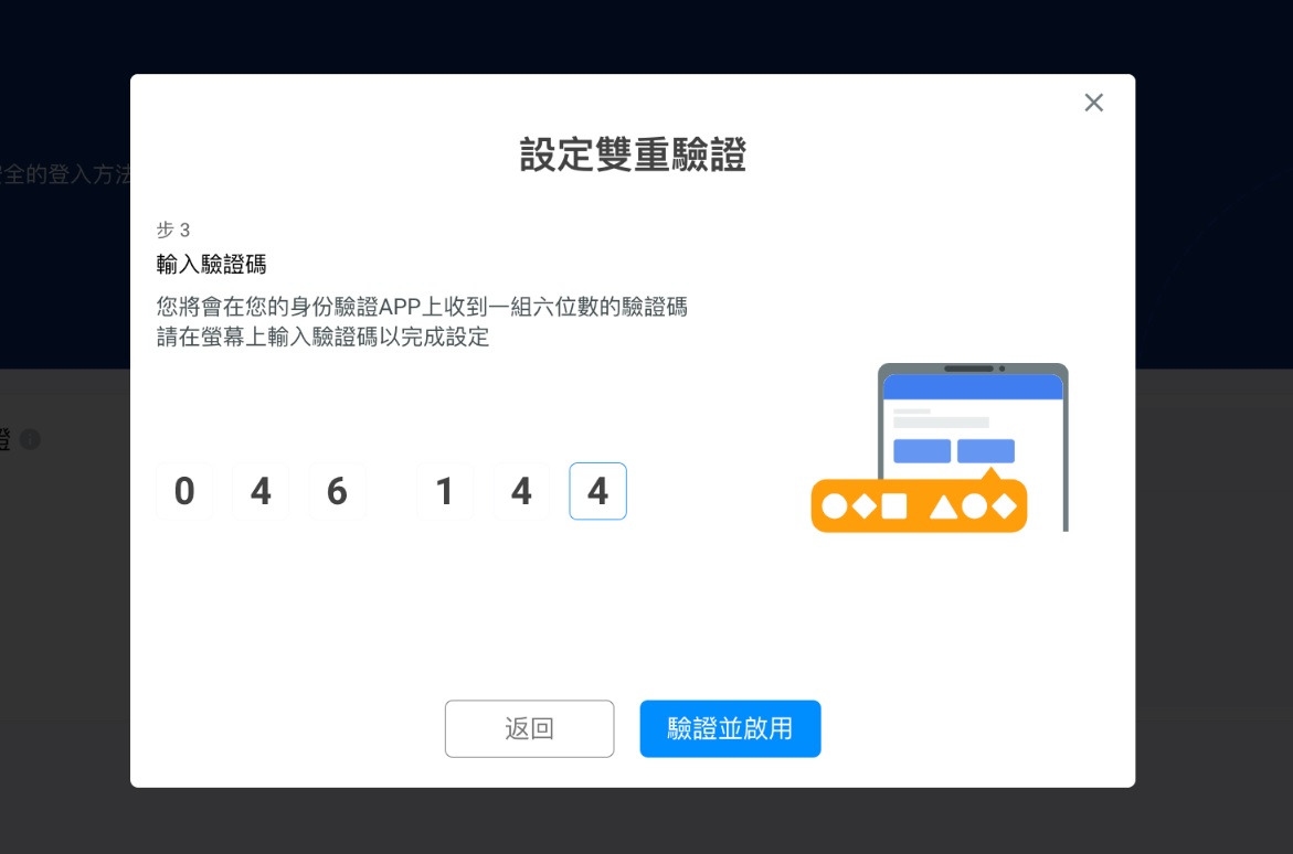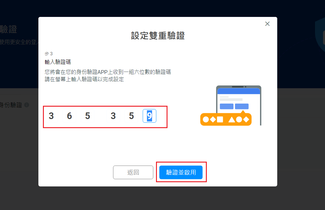 - 輸入驗證應用程式發出的六位數驗證碼,然後點擊驗證並啟用。