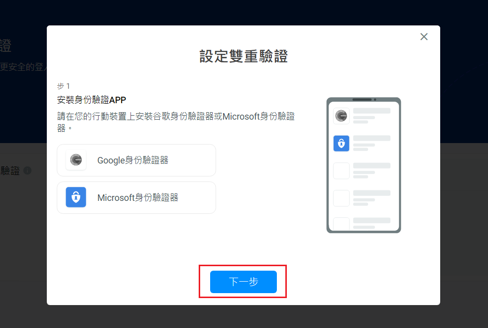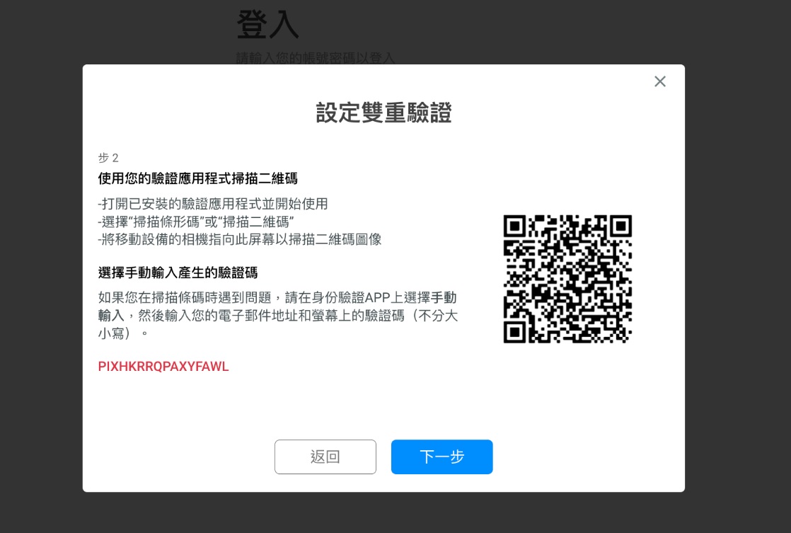 - 使用安裝在流動裝置的身份驗證應用程式,掃描螢幕上的條碼,然後點擊下一步。