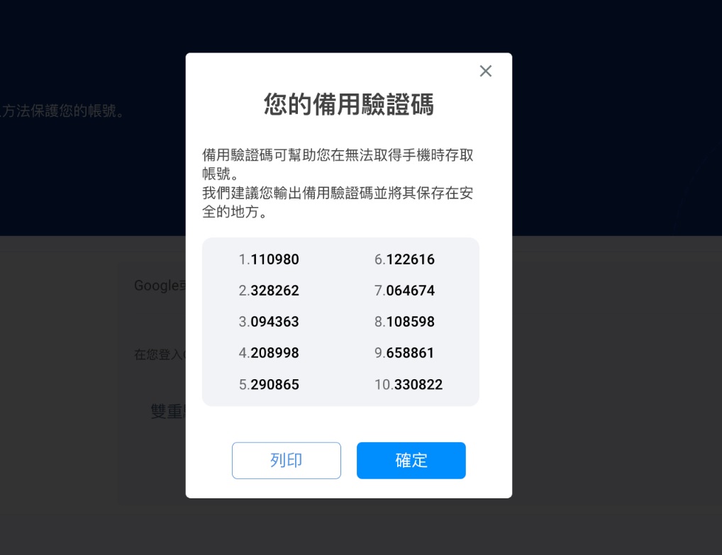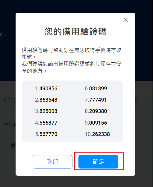 - 完成後,會顯示備用驗證碼。保存備用驗證碼的副本,例如,點擊列印,然後點擊確定。