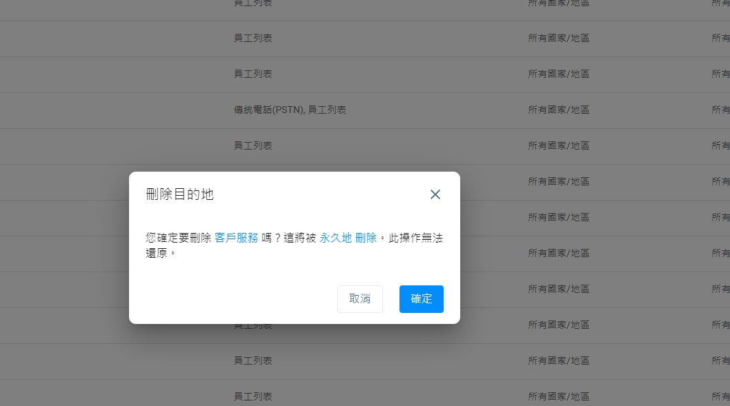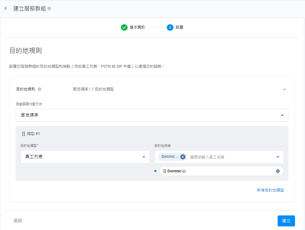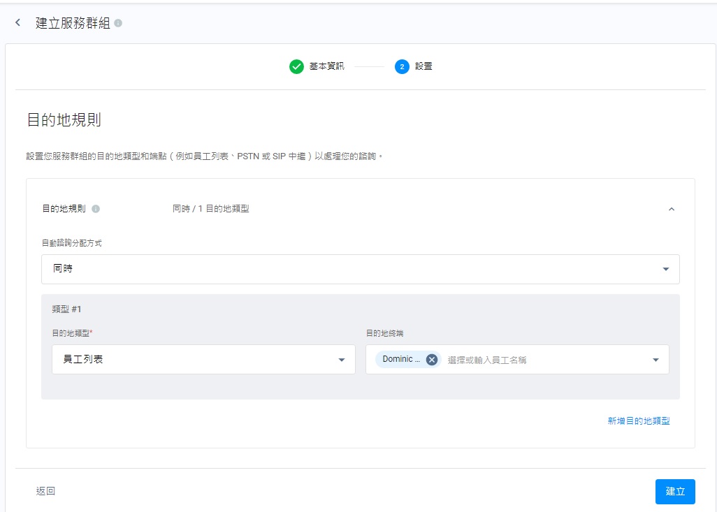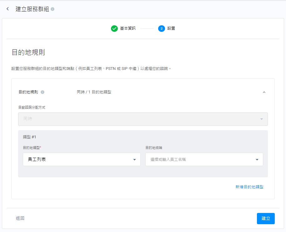 - 點撃目的地類型的下拉式清單,選擇員工列表、傳統電話(PSTN)或SIP中繼連結,以及根據目的地類型,為員工列表加入員工姓名、傳統電話(PSTN)加入電話號碼,以及SIP中繼連結加入Trunk Number。如有需要,你可以點撃新增目的地類型,以新增目的地類型和其對應的目的地終端。