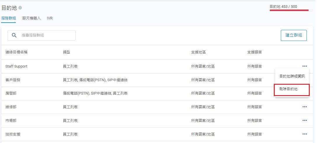 - 點擊該服務群組的刪除目的地。
