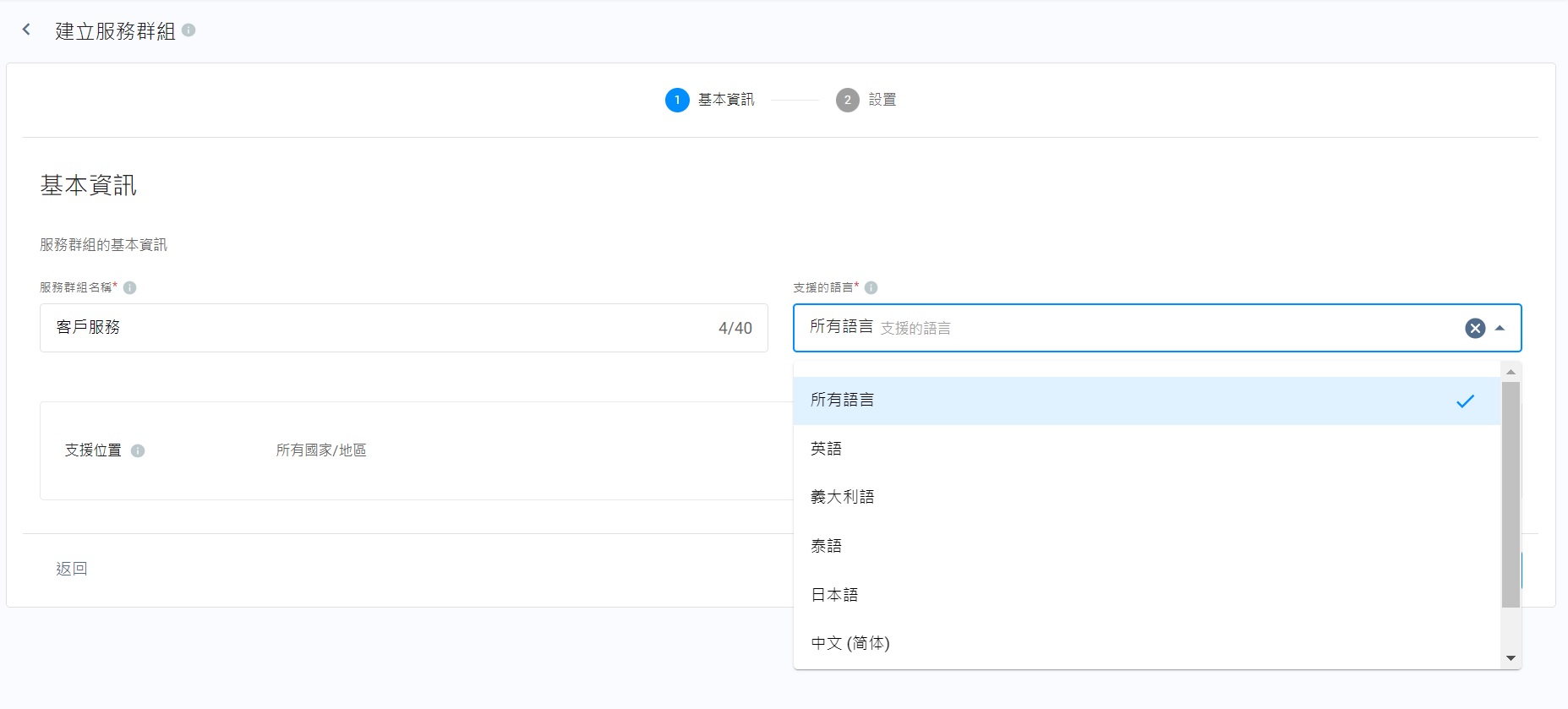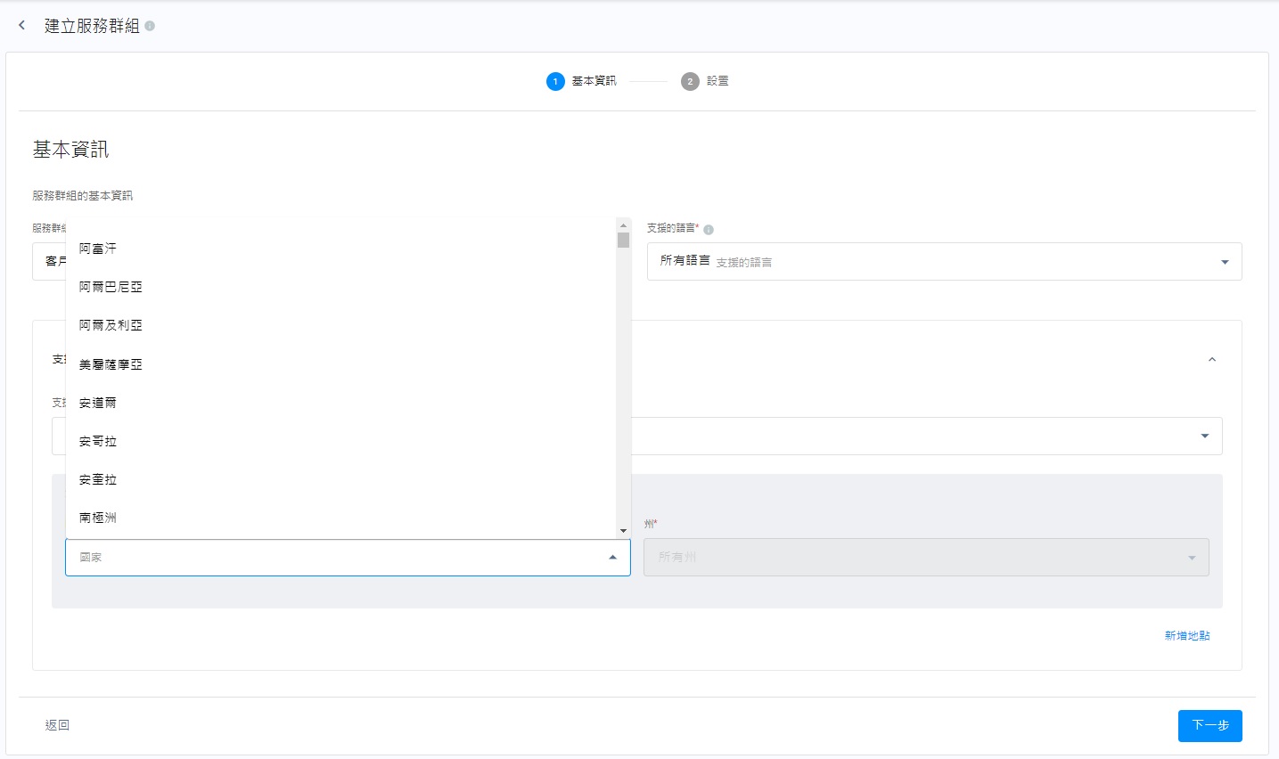 - 點擊支援位置的下拉式清單,選擇支援所有國家/地區,或國家/地區。當選擇國家/地區後,你需要選舉國家以及該國家的州份。如你的支援團隊,支援超過一個國家,可點擊新增地點,以增加支援的國家以及其州份。
