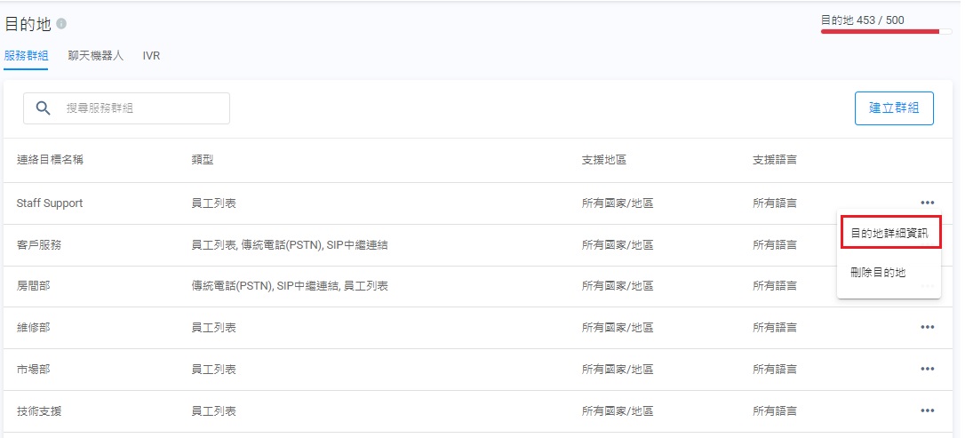 - 點擊該服務群組的目的地詳細資訊。