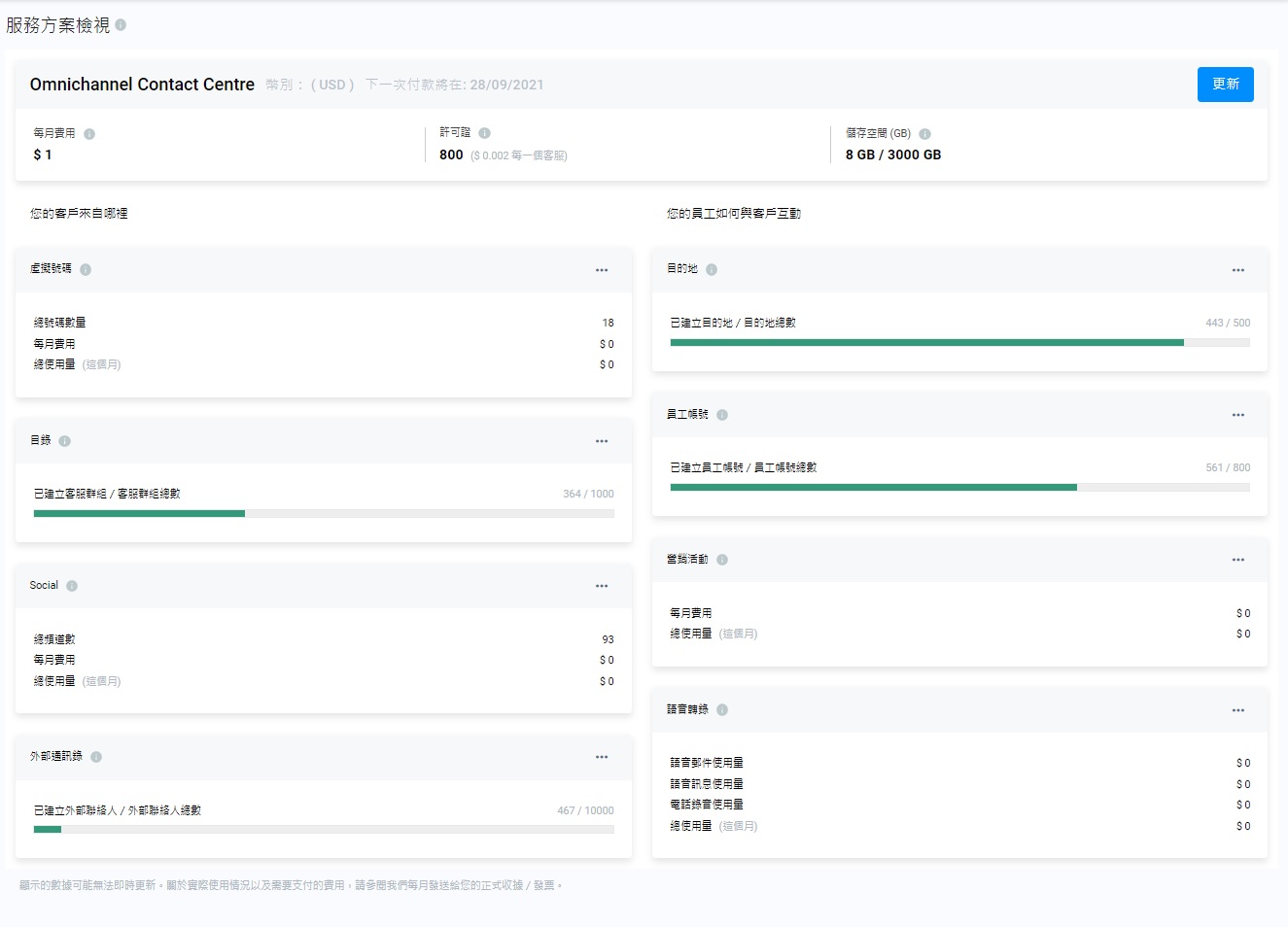 如果你希望升級服務方案,按更新鍵,使用電子郵件,聯絡 CINNOX 銷售團隊。
