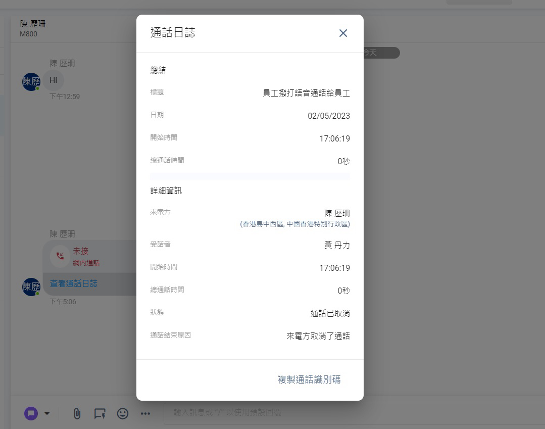 每次你或其他人在 CINNOX 上撥打電話或接聽來電時,都會將通話歷史紀錄到聊天室中。