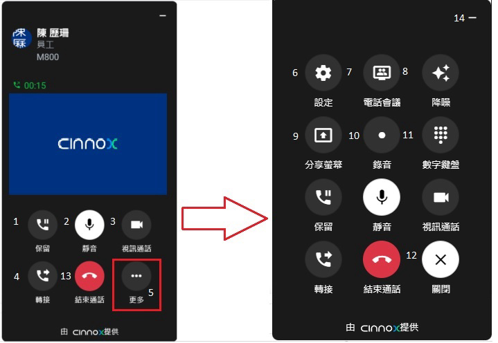 - 轉接 (4) - 轉接通話予其他客服,轉接方法包括:詢問轉接和盲轉接。詳情請參考本指南的轉接通話部份。