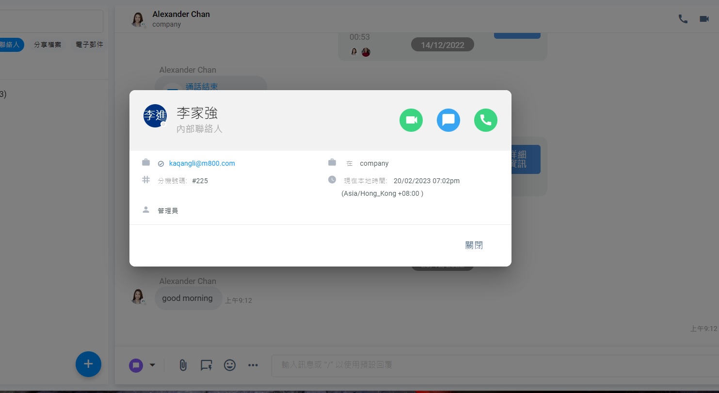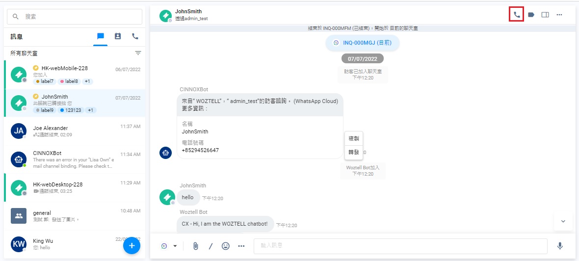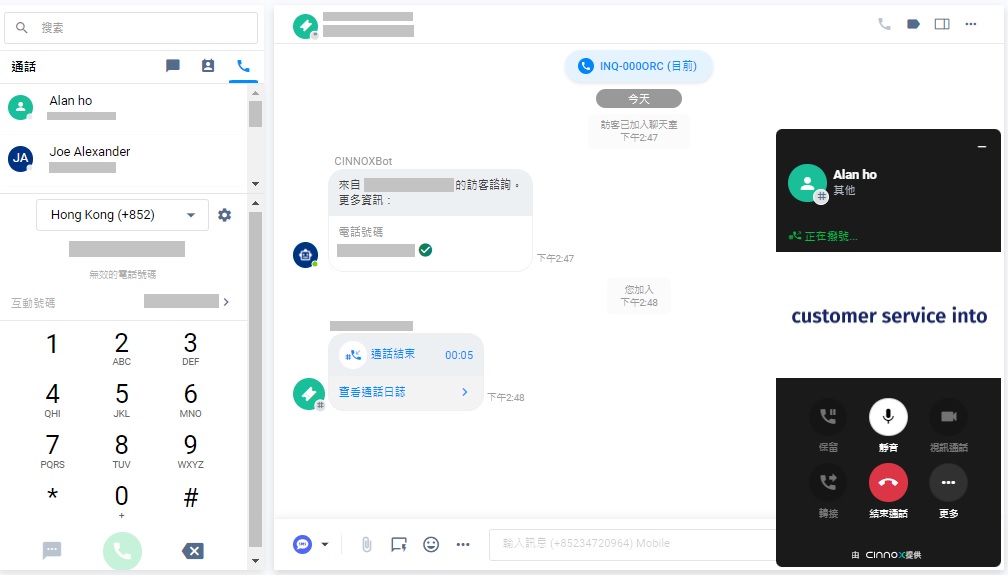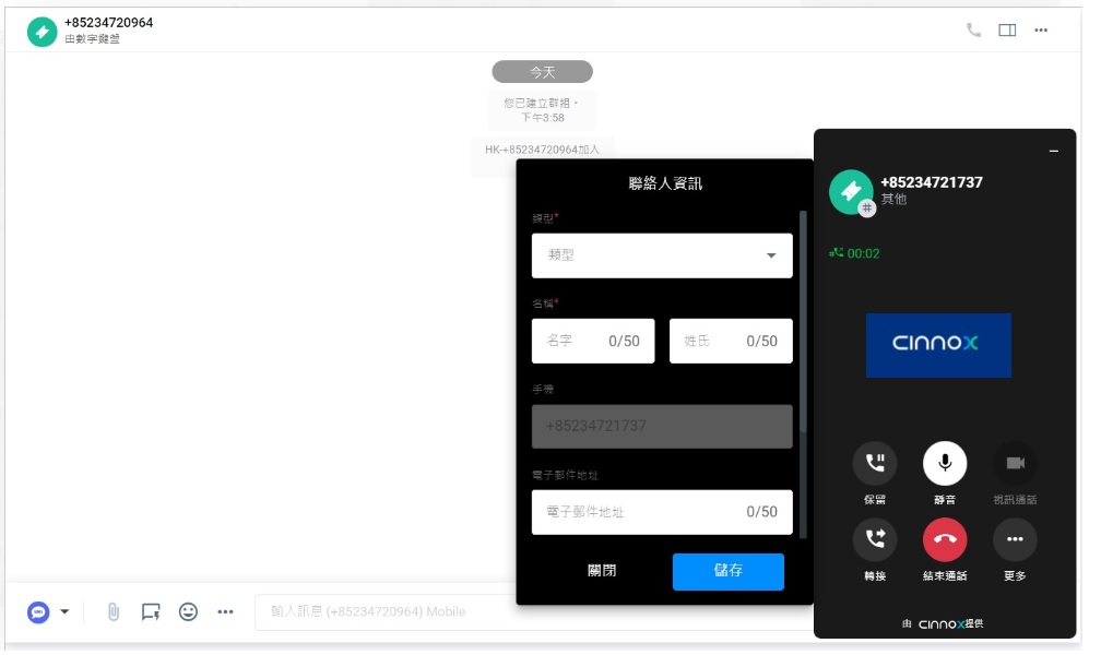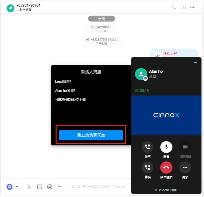 當員工在互動模式下撥打電話號碼時,員工可以選擇儲存受話者聯絡資料,並為其建立諮詢聊天室。