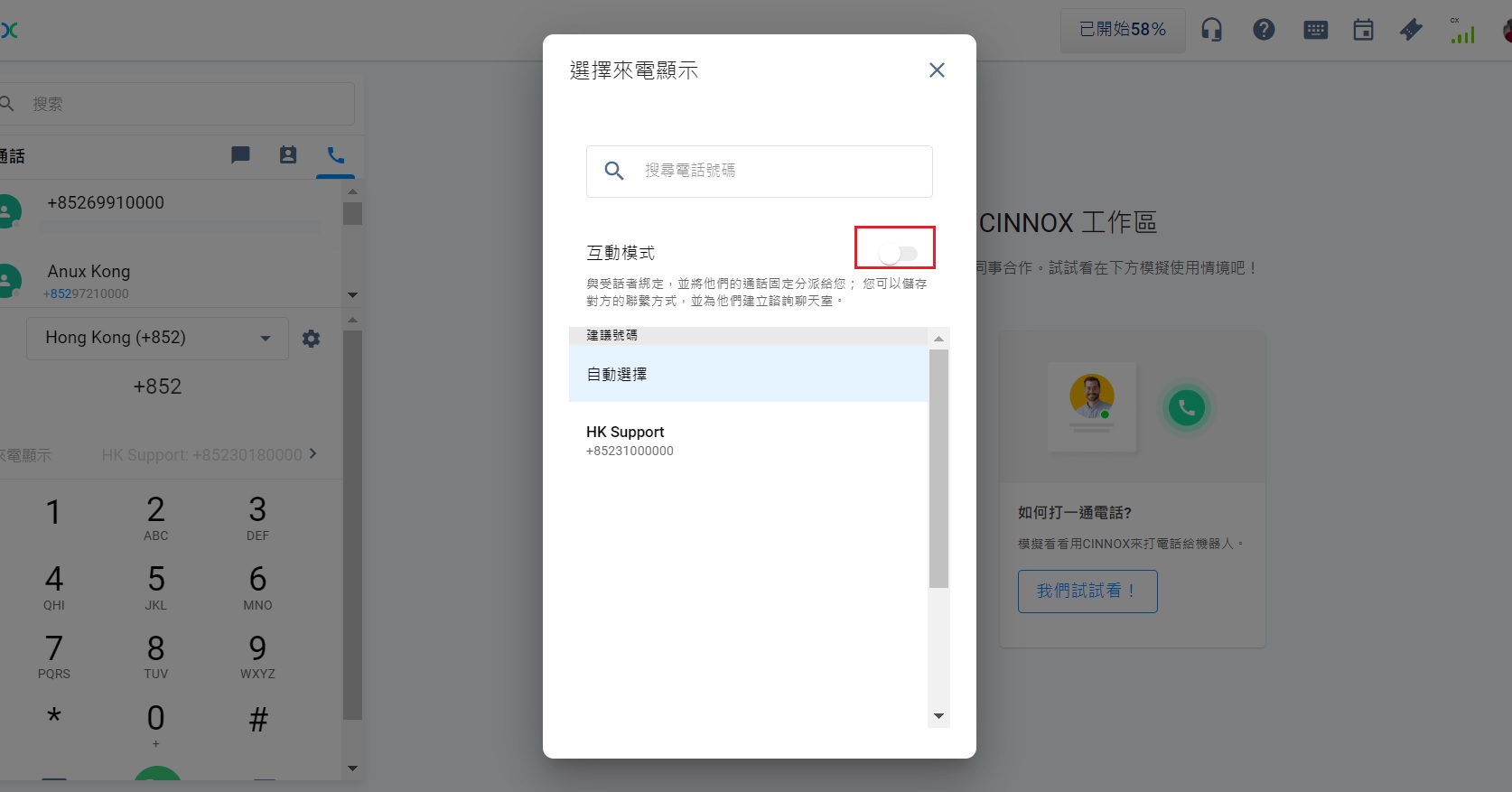 互動模式是一種CINNOX通話功能,可在訪客和使用虛擬號碼通話時,綁定到指定工作人員。當下次訪客使用相同號碼通話時,其通話將被直接轉到,第一次通話時接聽來電的工作人員。
