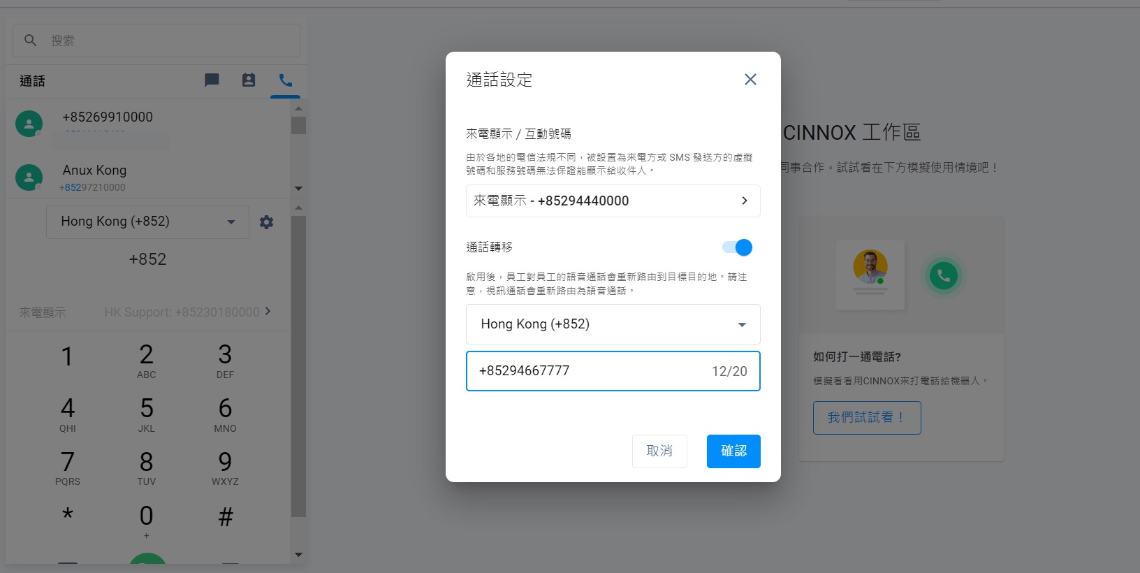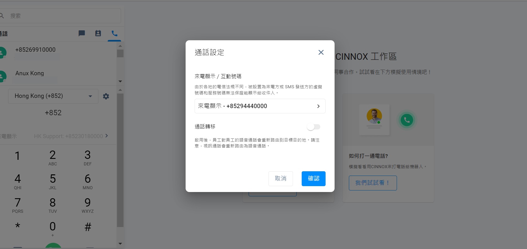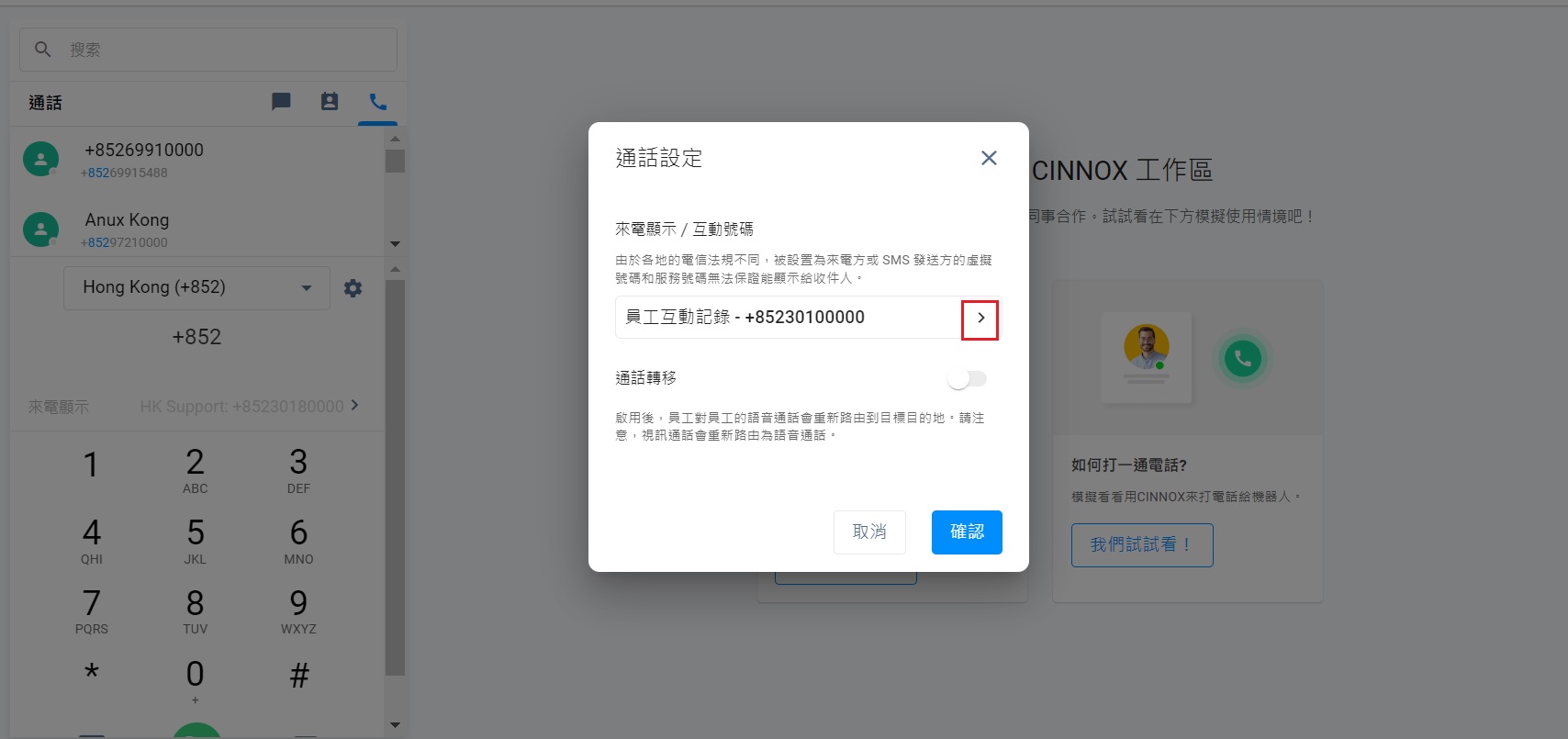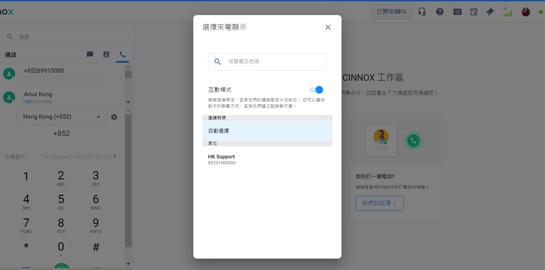 在向客戶或訪客撥打網外電話時,員工可以在互動模式下,將他們使用中的虛擬電話號碼設定為來電顯示號碼。