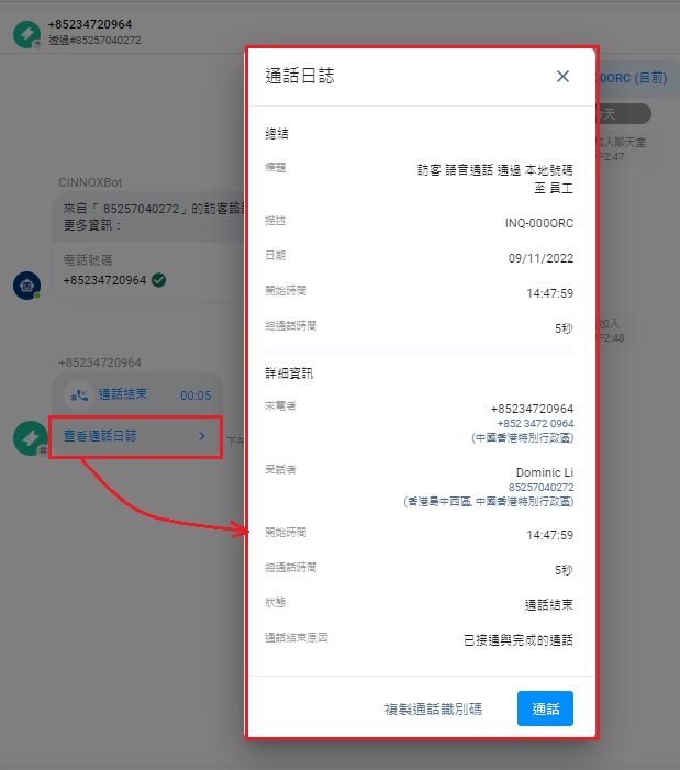 每次你或其他人在CINNOX上撥打或接聽電話時,它都將通話歷史記錄到聊天室的通話日誌中。此通話日誌包含以下資料: