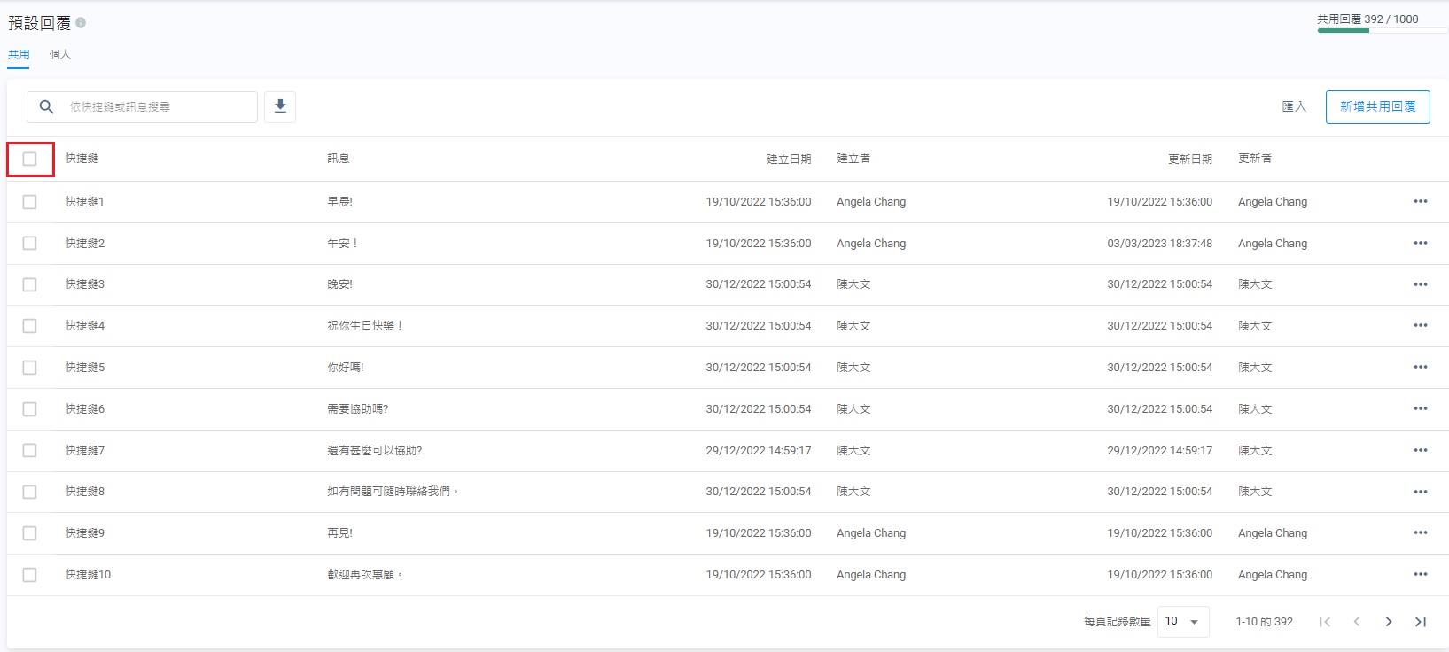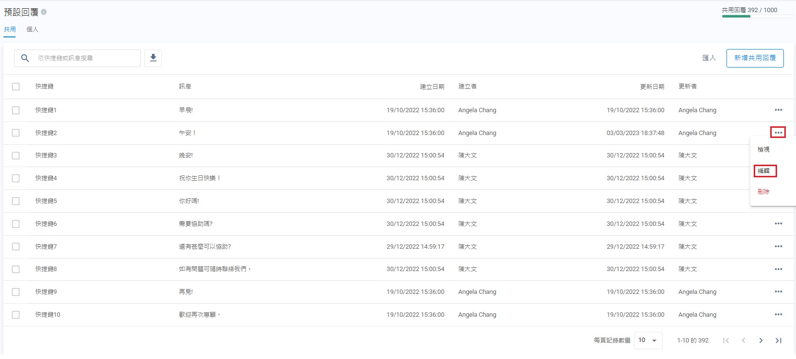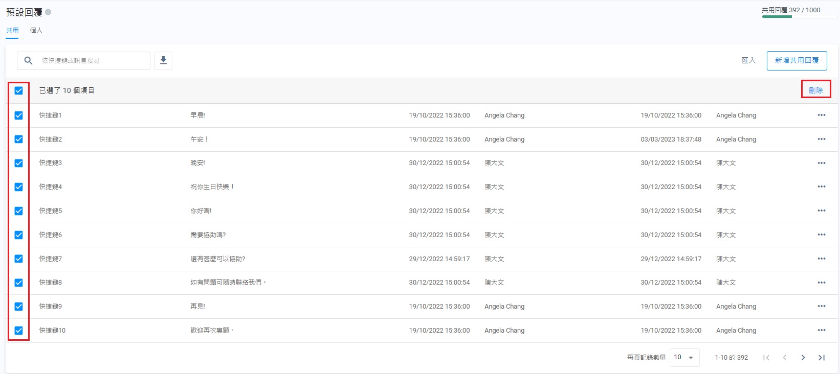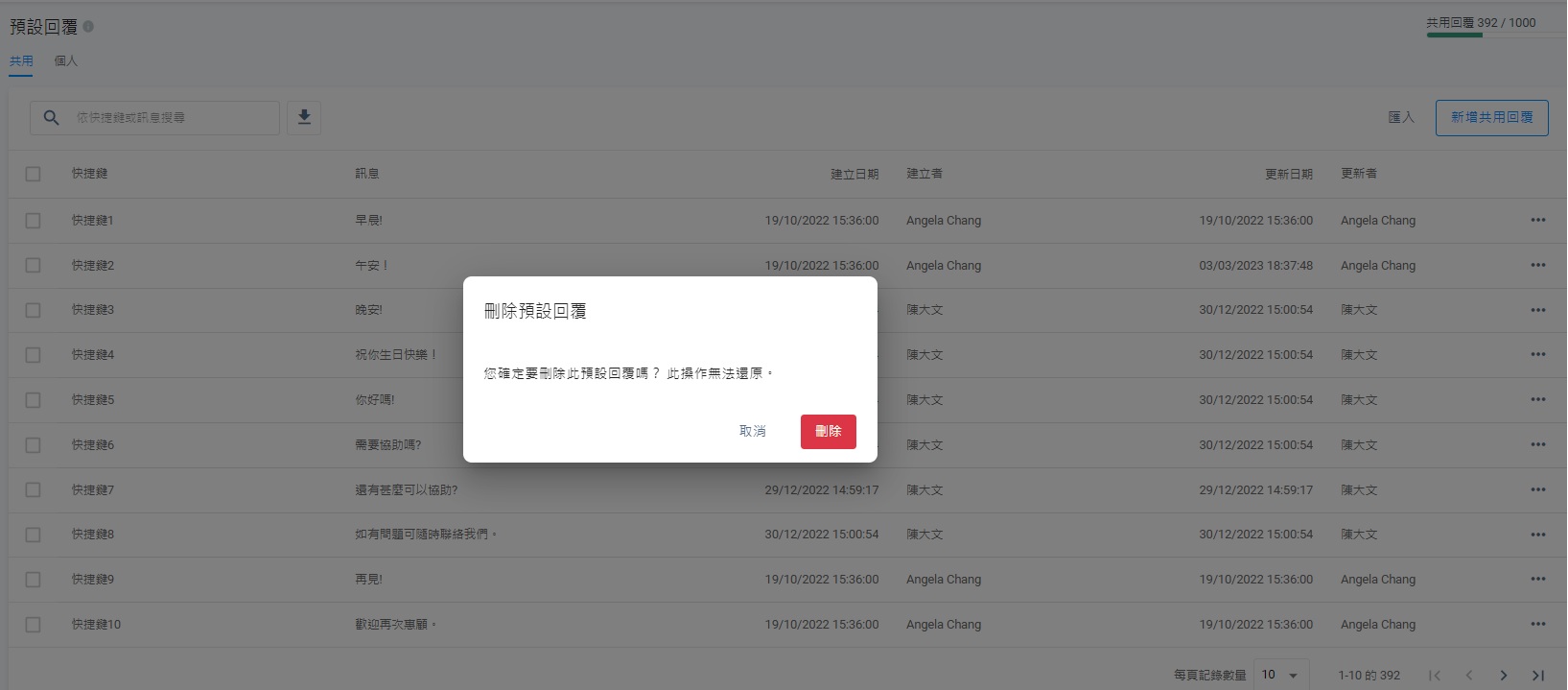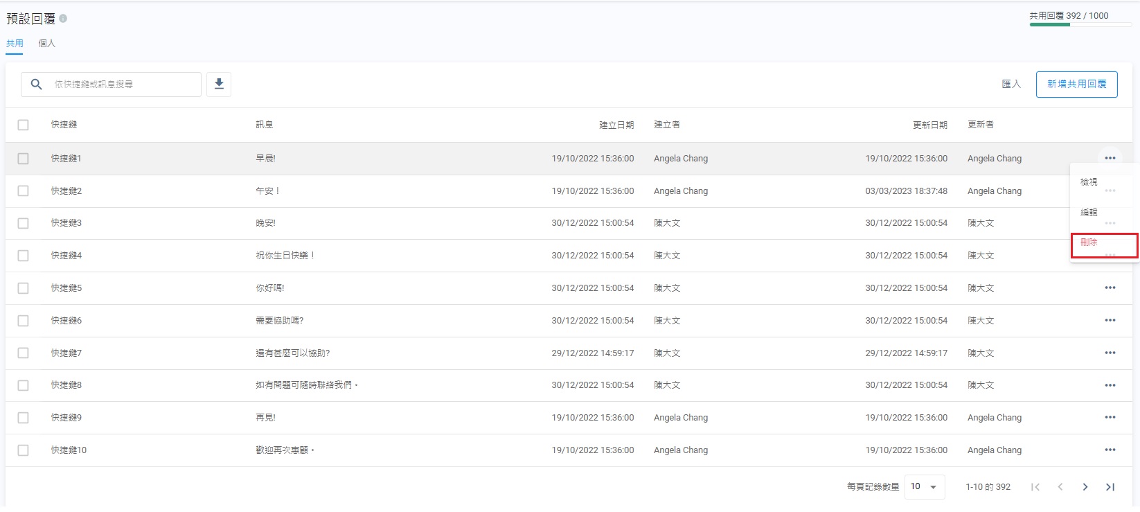 - 在預設回覆管理的頁面上,選擇共用或個人分頁,點擊刪除。