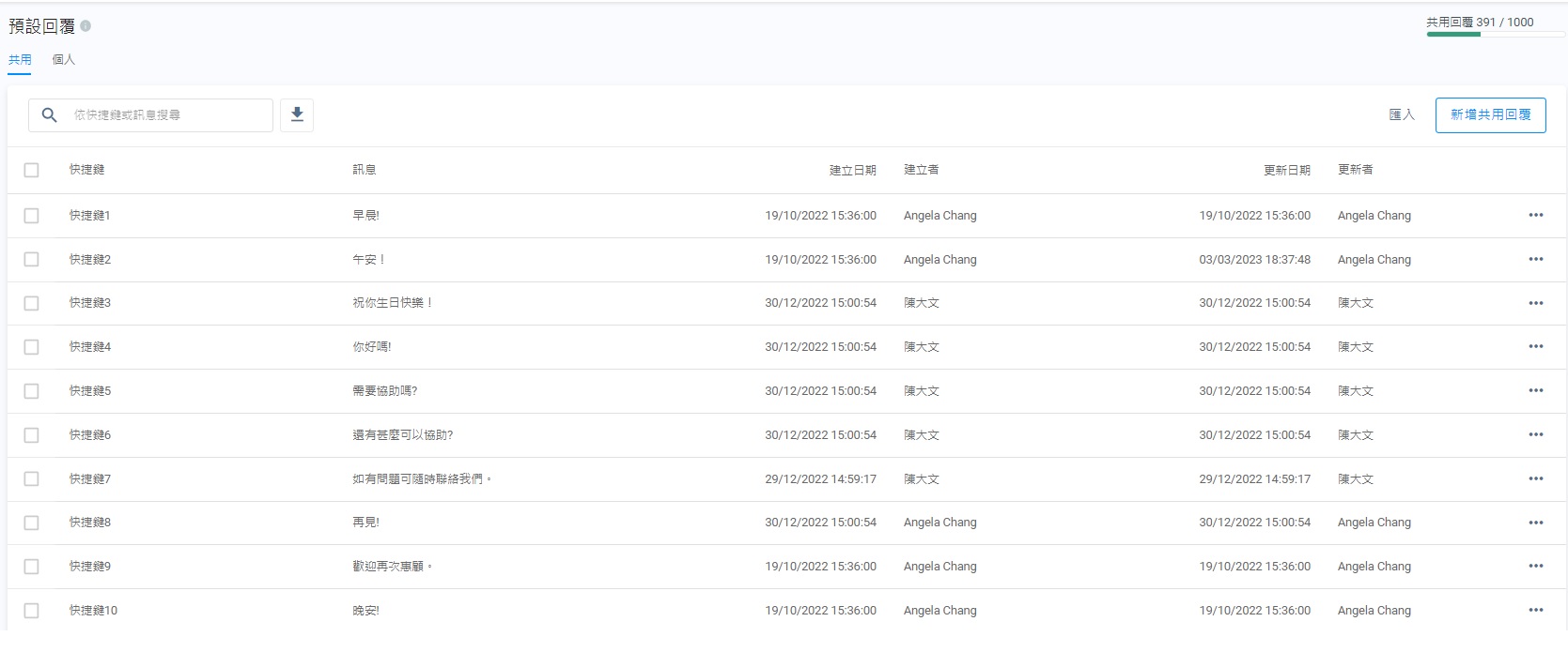 - 在預設回覆管理頁面上,選擇共用或個人分頁。