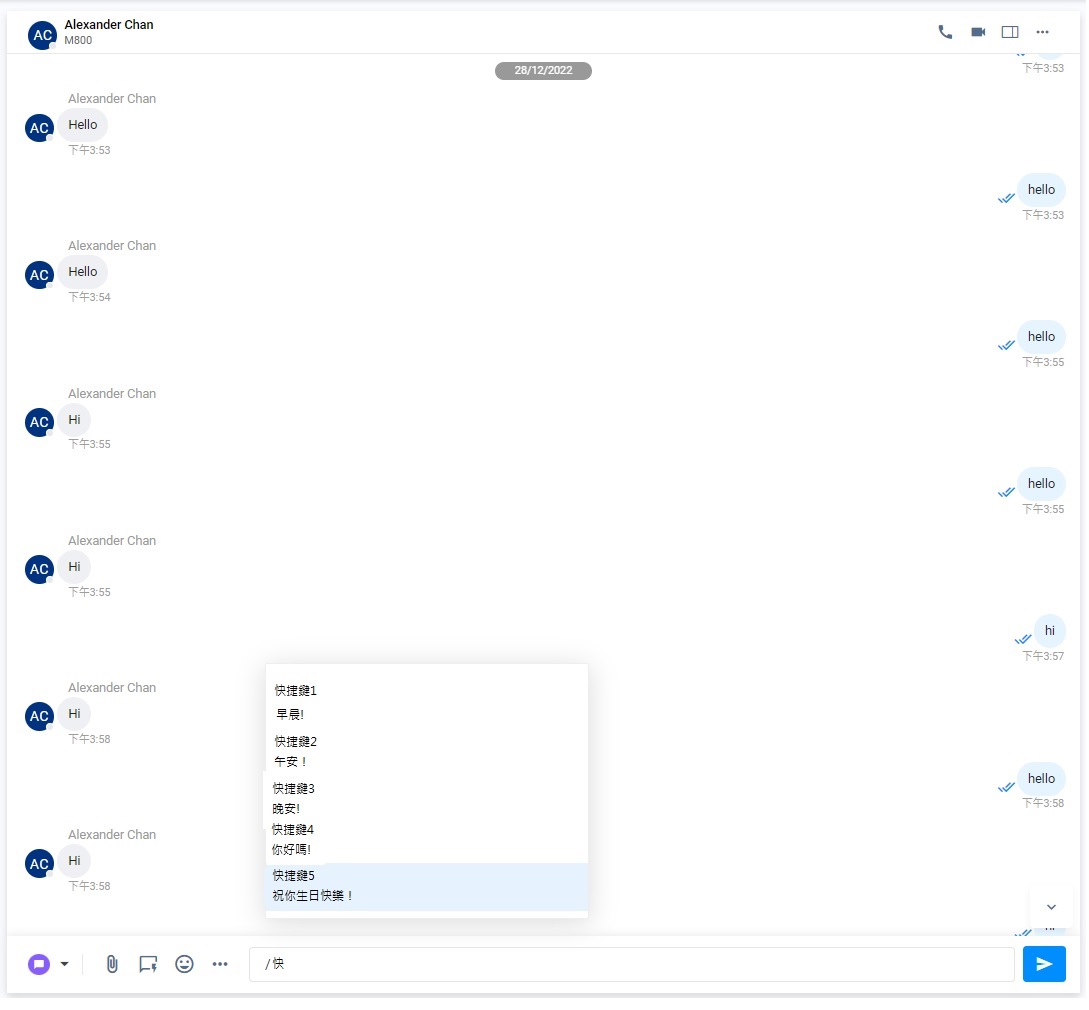 - 在聊天室的文本輸入欄,輸入"/"作為快捷鍵,並選擇5個當中其中1個預設回覆。這裡的預設回覆,根據字母順序排列。