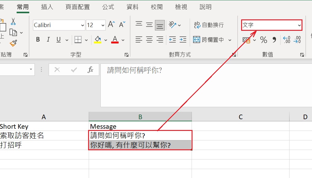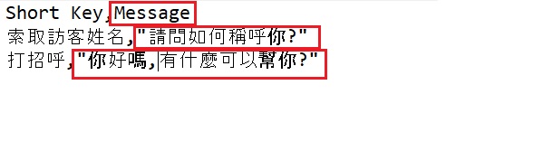 Message 欄裡的你好嗎, 有什麼可以幫你?含有逗號。於是,文字分隔成兩行,你好嗎在Message欄,而**有什麼可以幫你?**則在另一欄。