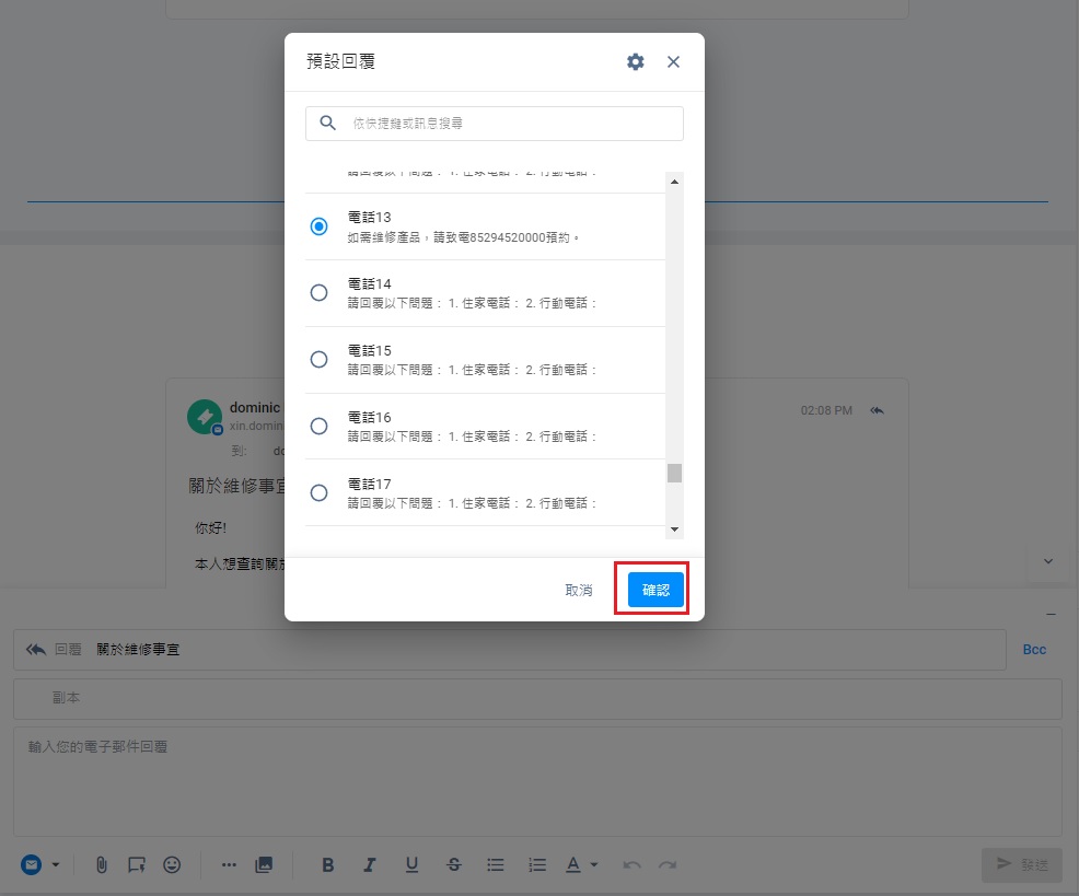 - 在搜尋欄輸入快捷鍵或預設回覆的內容,並選擇合適的預設回覆。