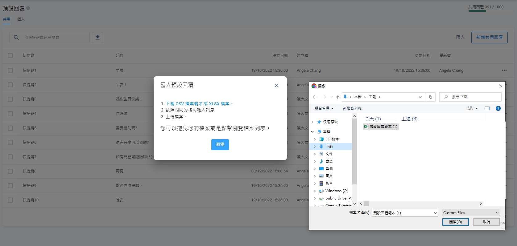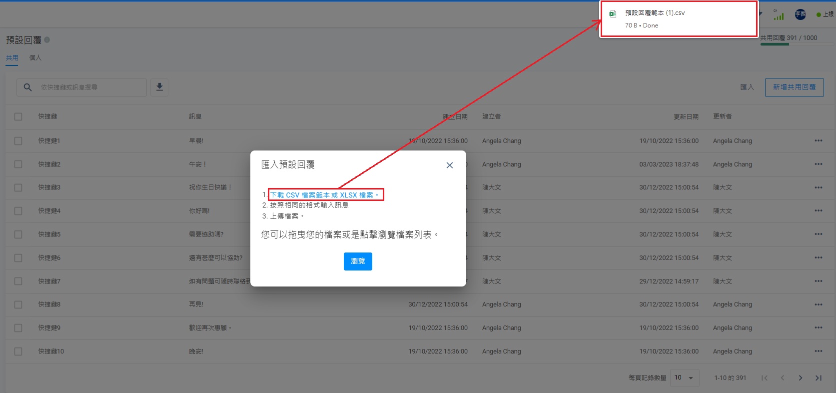 - 在匯入預設回覆的彈出式視窗,點擊在下載CSV檔案範本或XLSX檔案這句子上CSV檔案範本或XLSX檔案任何一組字詞。