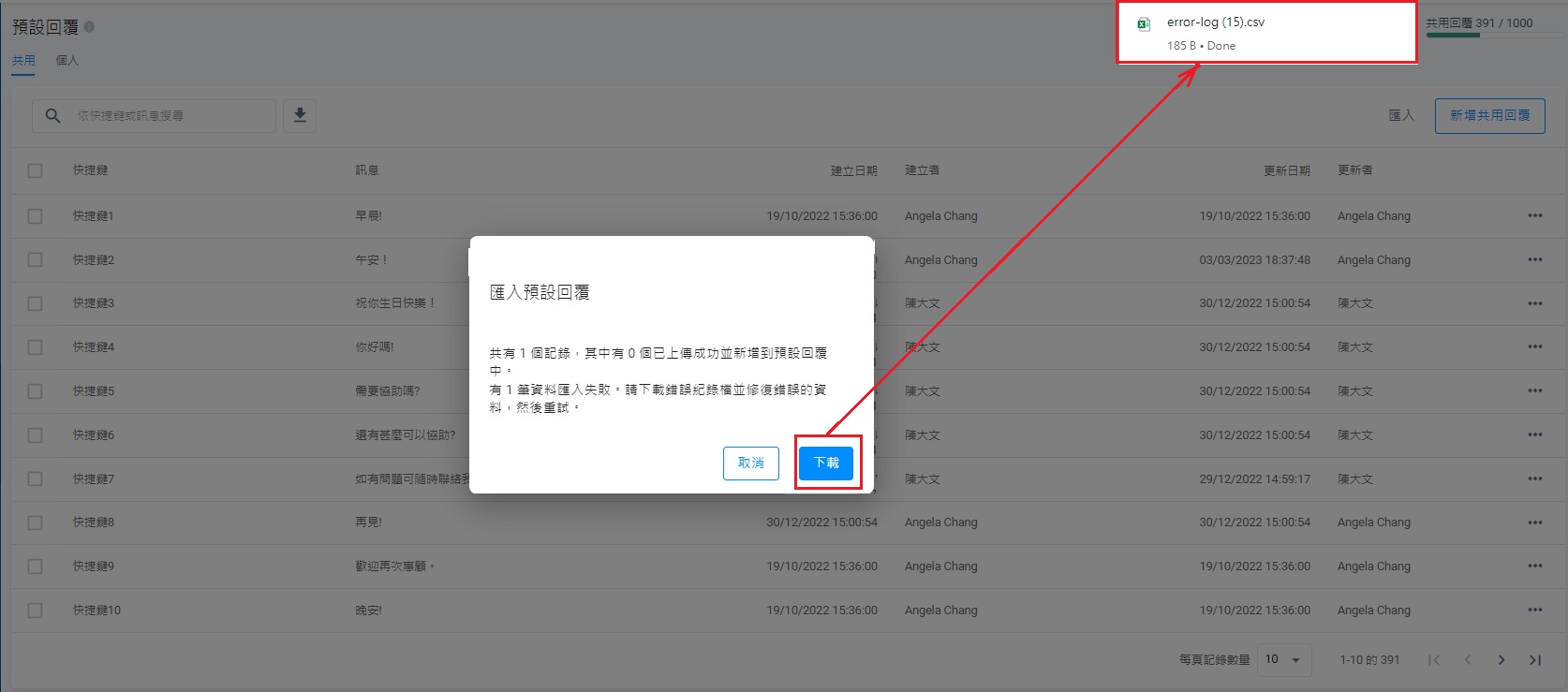 - 返回匯入預設回覆的彈出式視窗,用拖曳形式從新上載更新的error-log.csv檔案。你亦可以點擊瀏覽,然後從文件夾中選擇上載的CSV檔案。