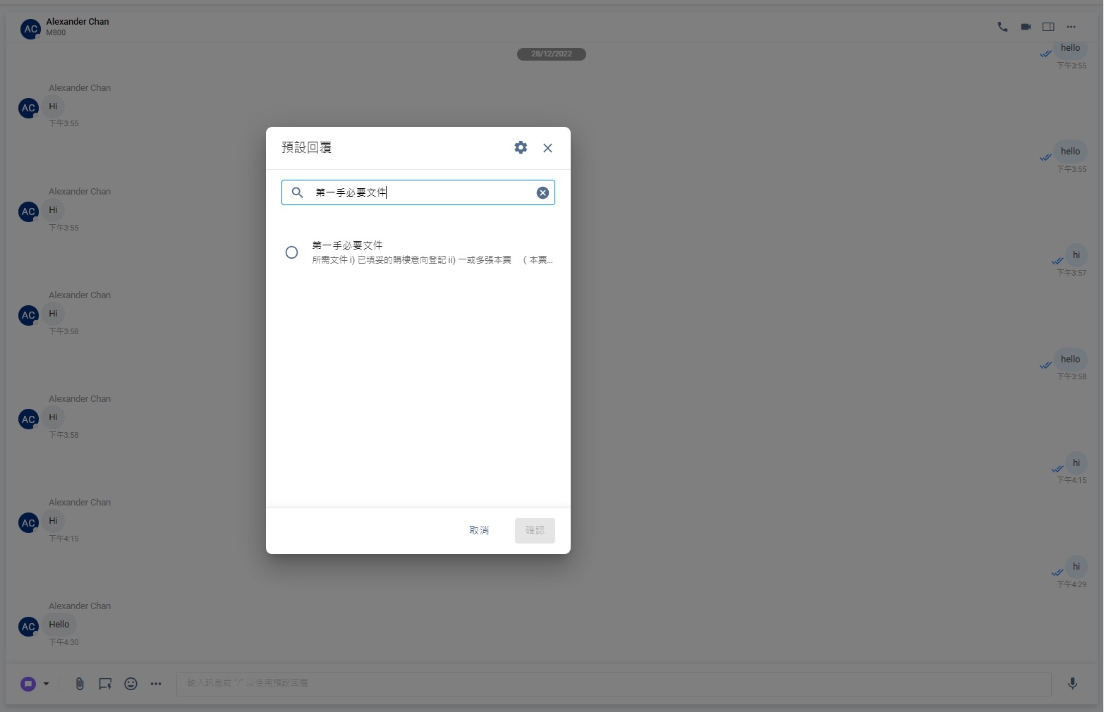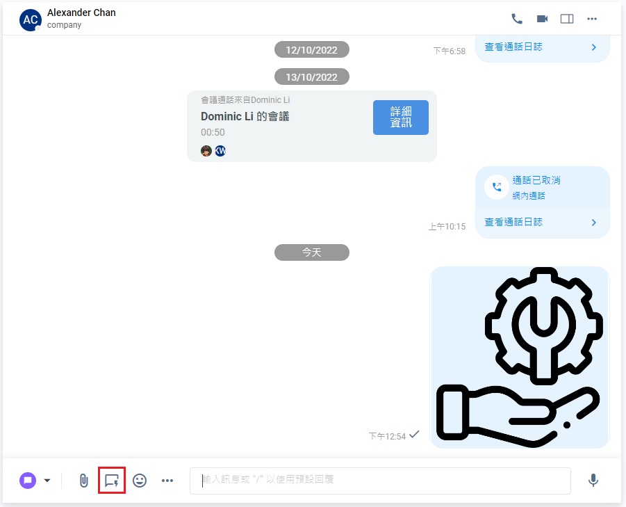 - 你亦可以在 "/"後輸入關鍵字,搜尋適當的預設回覆。