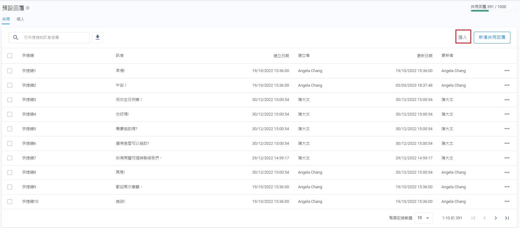 匯入個人或共用預設回覆