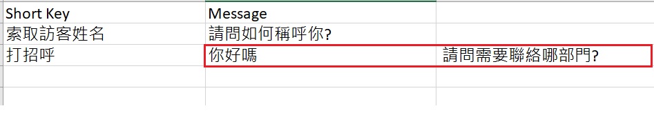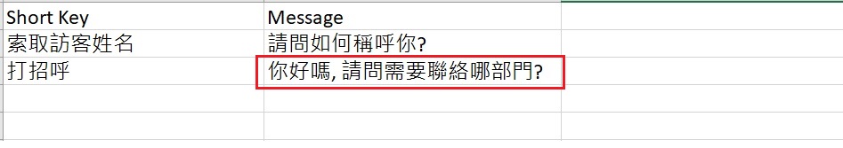 例如:當你輸入**你好嗎, 請問需要聯絡哪部門?**到Message 欄時,檔案顯示如下:
