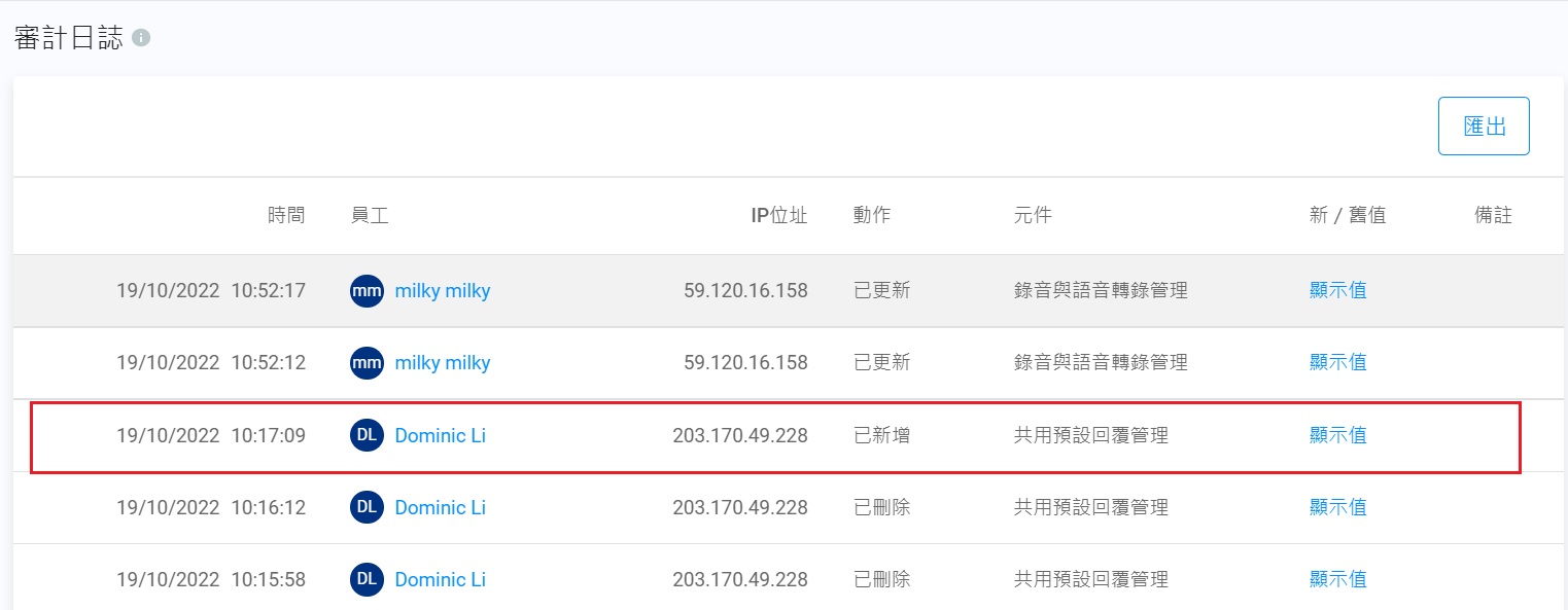 審計日誌追蹤和記錄共用預設回覆的變化,包括新增、更新以及刪除。如要查看審計日誌,從控制面板導航到管理>安全>審計日誌。