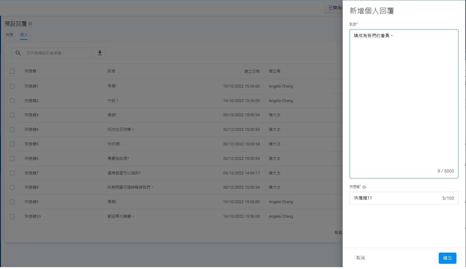 - 輸入快捷鍵。建議快捷鍵為易記和與回覆內容有關的字詞。快捷鍵必須獨一無二,系統會檢查該快捷鍵,是否在共用回覆或其他回覆上重複。快捷鍵上限為100個字符。