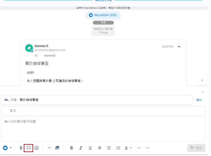 - 接受了電郵諮詢後,點擊回覆鍵。在聊天室的文本輸入欄,點擊 "閃電"圖標。