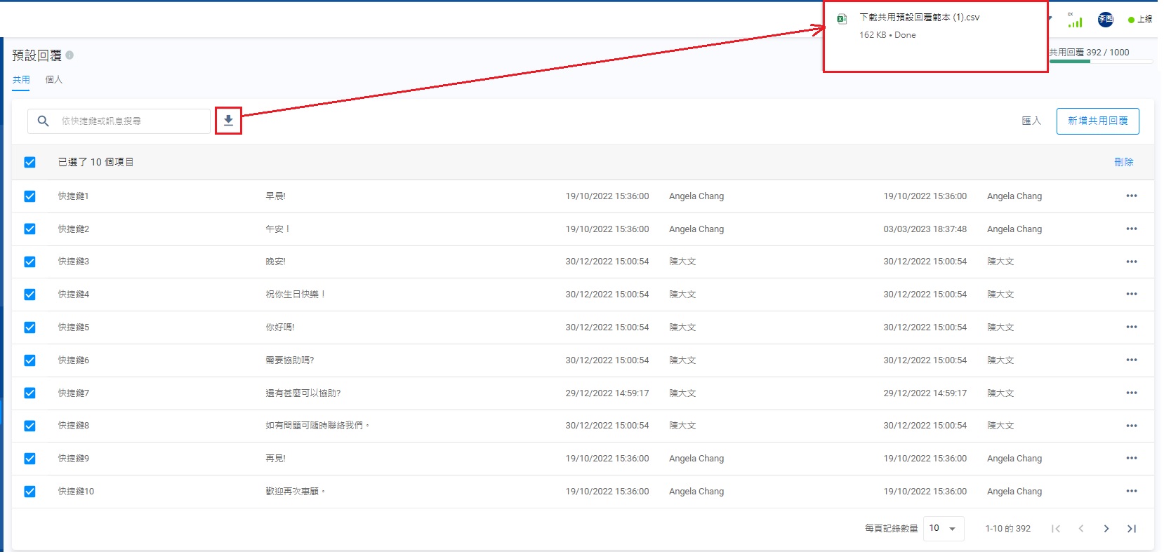 管理員或擁有權限的自訂角色員工 - 可以查看、刪除以及下載共用的預設回覆。它無分權限,所有員工均可使用。
