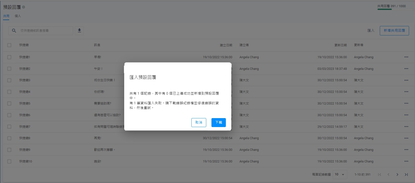 | 共有 3 個記錄,其中有 2 個已上傳成功並新增到預設回覆中。 無法匯入1記錄。請修復錯誤的檔案,然後重試。 |