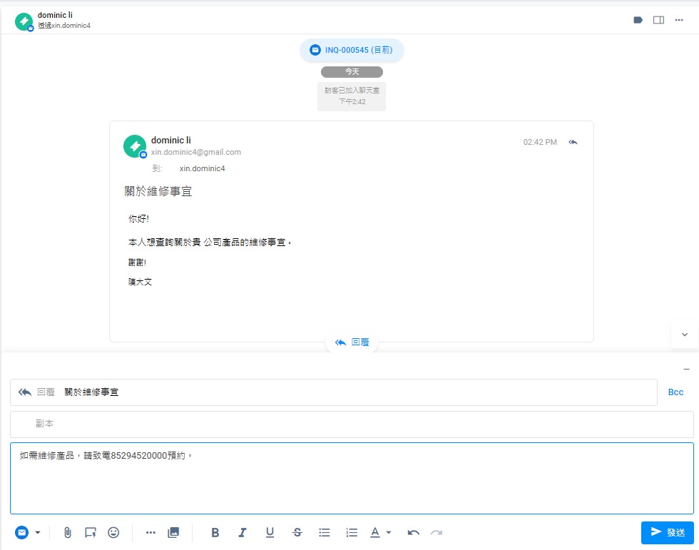- 選擇了的預設回覆出現在電郵內。點擊發送圖標,或按鍵盤的輸入鍵,發送預設回覆。