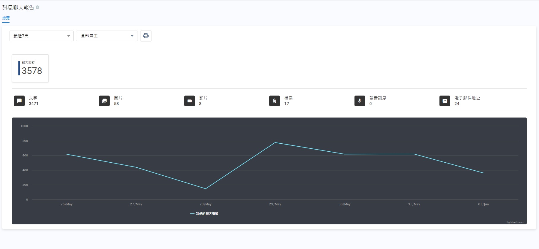 如需列印訊息聊天報告,包括總覽中的圖表和數據,請點擊圖表上方中央的列印圖標。