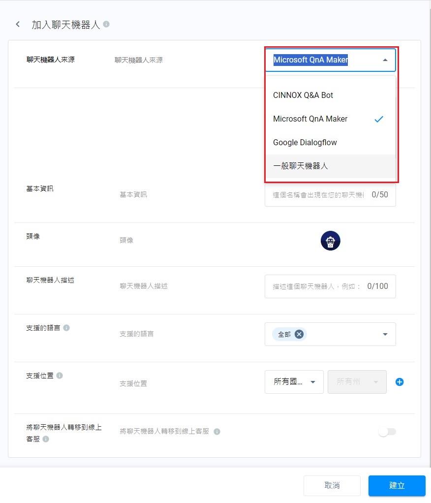 如果你使用的聊天機器人來源不是QnA Maker或Google Dialogflow,請使用一般聊天機器人。