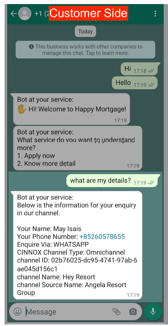 | channelPhoneNumber (for WhatsApp channel) | +85212345678 |