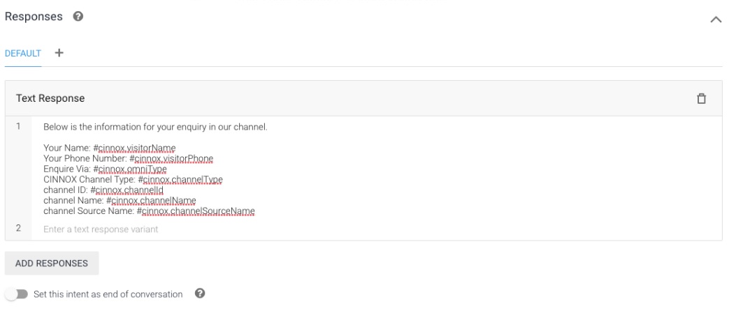 在Responses部份,用以下格式加入Text response variant,以回覆客戶: