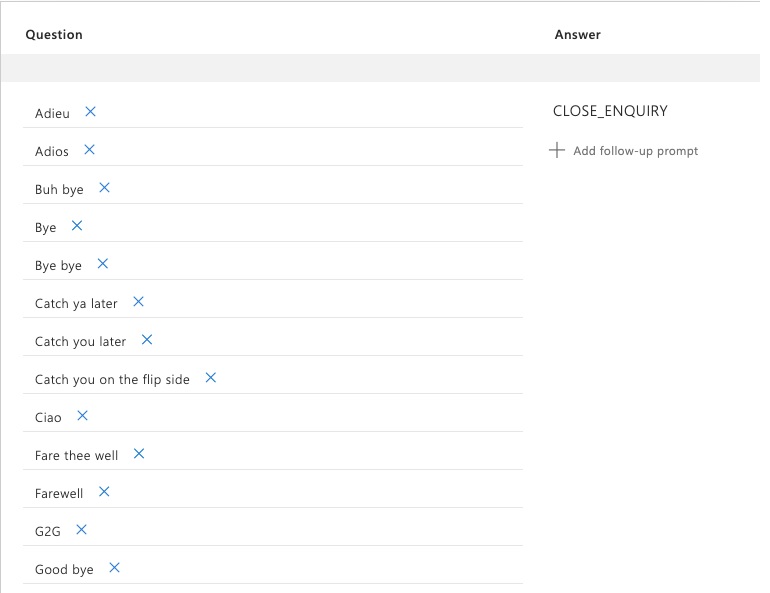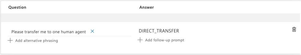 將關鍵字DIRECT_TRANSFER 設定為觸發聊天轉移到線上客服的Transfer flow答案。 你可以新增多個可能的問題來啟動轉移。