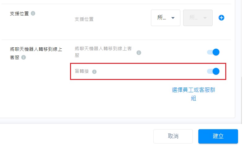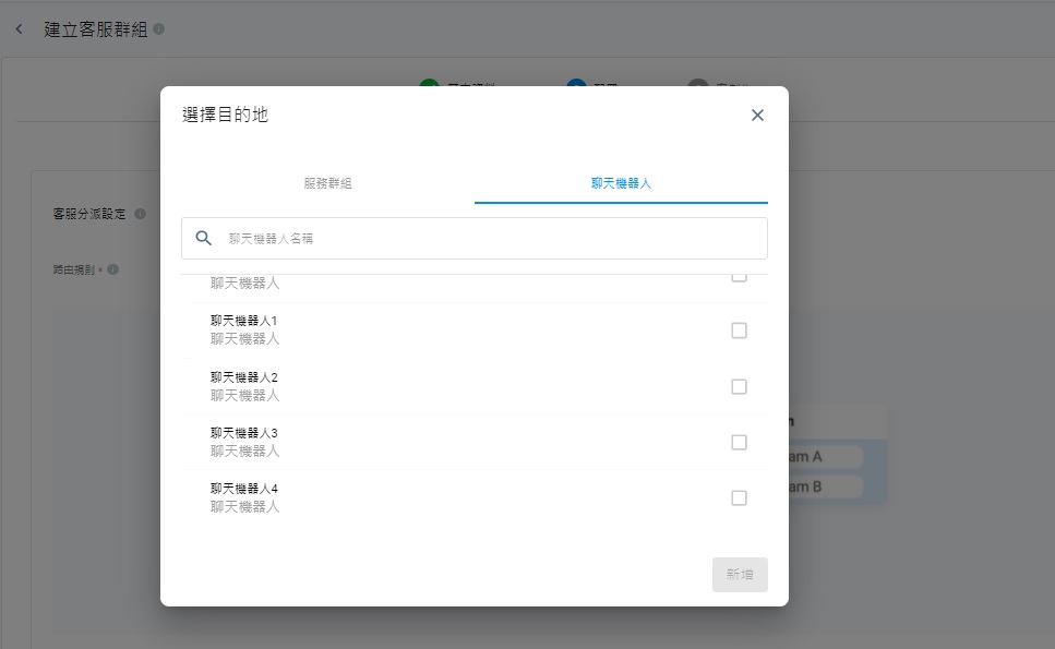 - 選擇一個客服群組,轉移諮詢到不包含聊天機器人的目的地,以避免諮詢從一個聊天機器人,轉移到另一個聊天機器人,從而做成循環轉移。