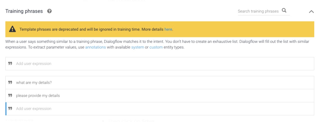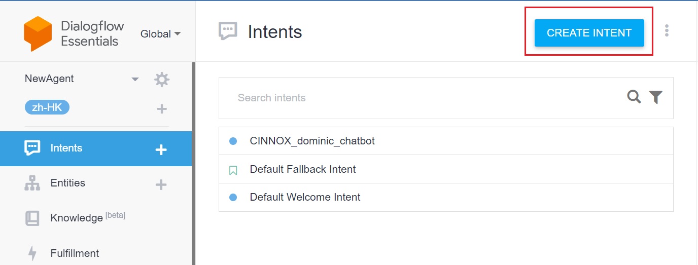 以上提及的情況同樣適用於客服群組(Tag)。點擊CREATE INTENT,建立新Intent,並使用以下Text Response。