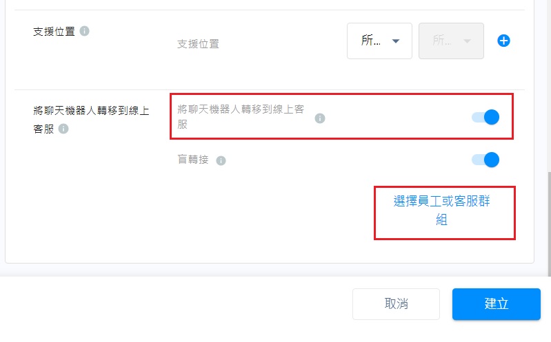 當訪客想找客服時,客服可以使用此功能,將聊天機器人正在處理的諮詢,轉移到相關的客服群組或員工,繼續與訪客交談。
