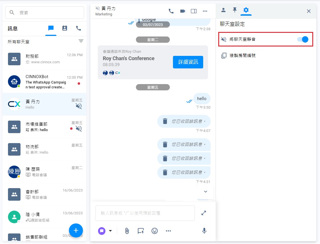 在諮詢或1對1聊天室中靜音/取消靜音消息通知: