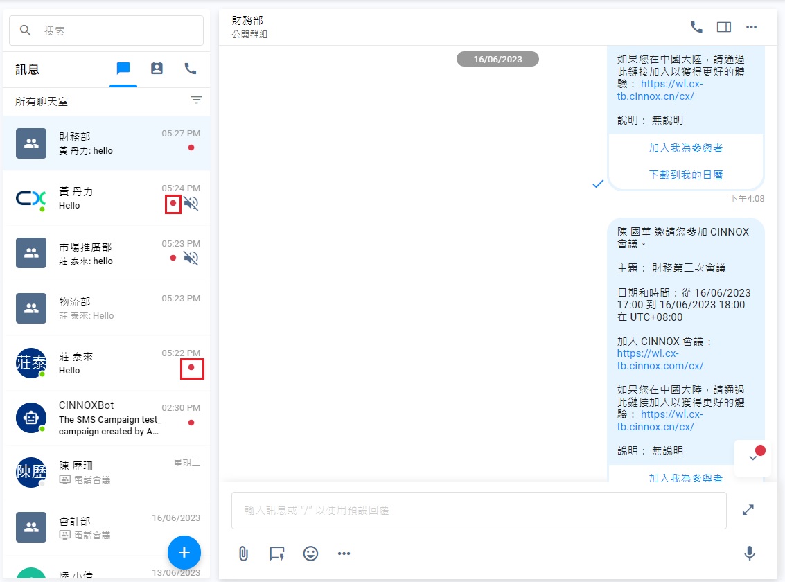 在聊天室,CINNOXbot系統訊息會提供以下訊息,例如: