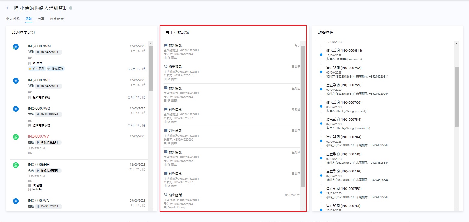 你可以導航到聯絡人管理>外部通訊錄,選擇指定客戶的聯絡人詳細資料,在其活動分頁中,跟踪每個客戶或員工發起諮詢的旅程。它提供了每個客戶與組織的完整通訊歷史記錄,包括每次對話的日期和時間,以及處理諮詢的員工及該員工詳細資料。