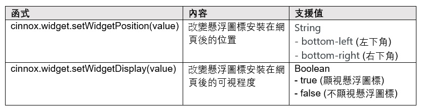 安裝了網頁懸浮圖標,以及初始化(Initialisation)後,你可以調用(Call) "window.onCinnoxReady"這個函式(Function),從而改變網頁懸浮圖標的屬性。