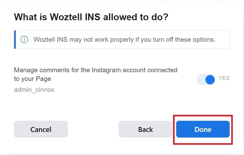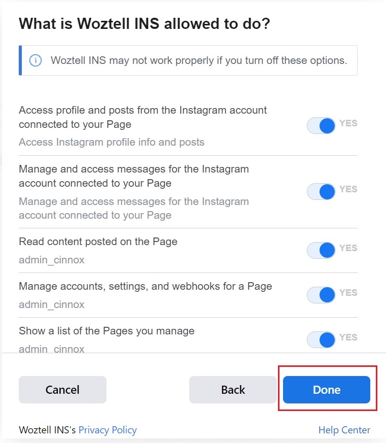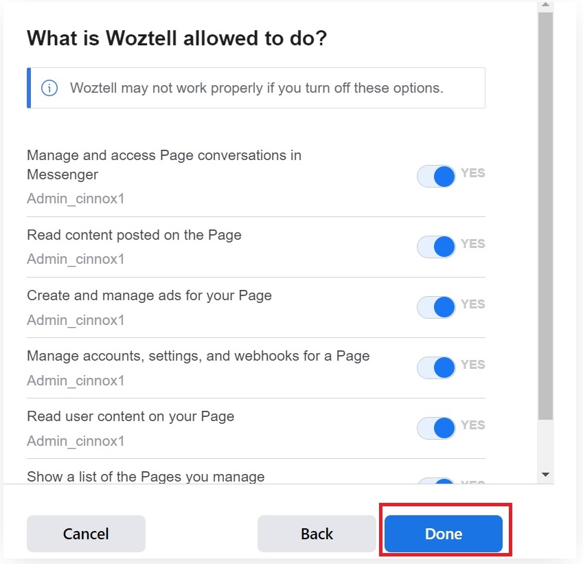 為了在WOZTELL頻道執行所需設定以及獲得相關許可,請在產生Account Access Token前,謹慎選擇範圍和許可設定。