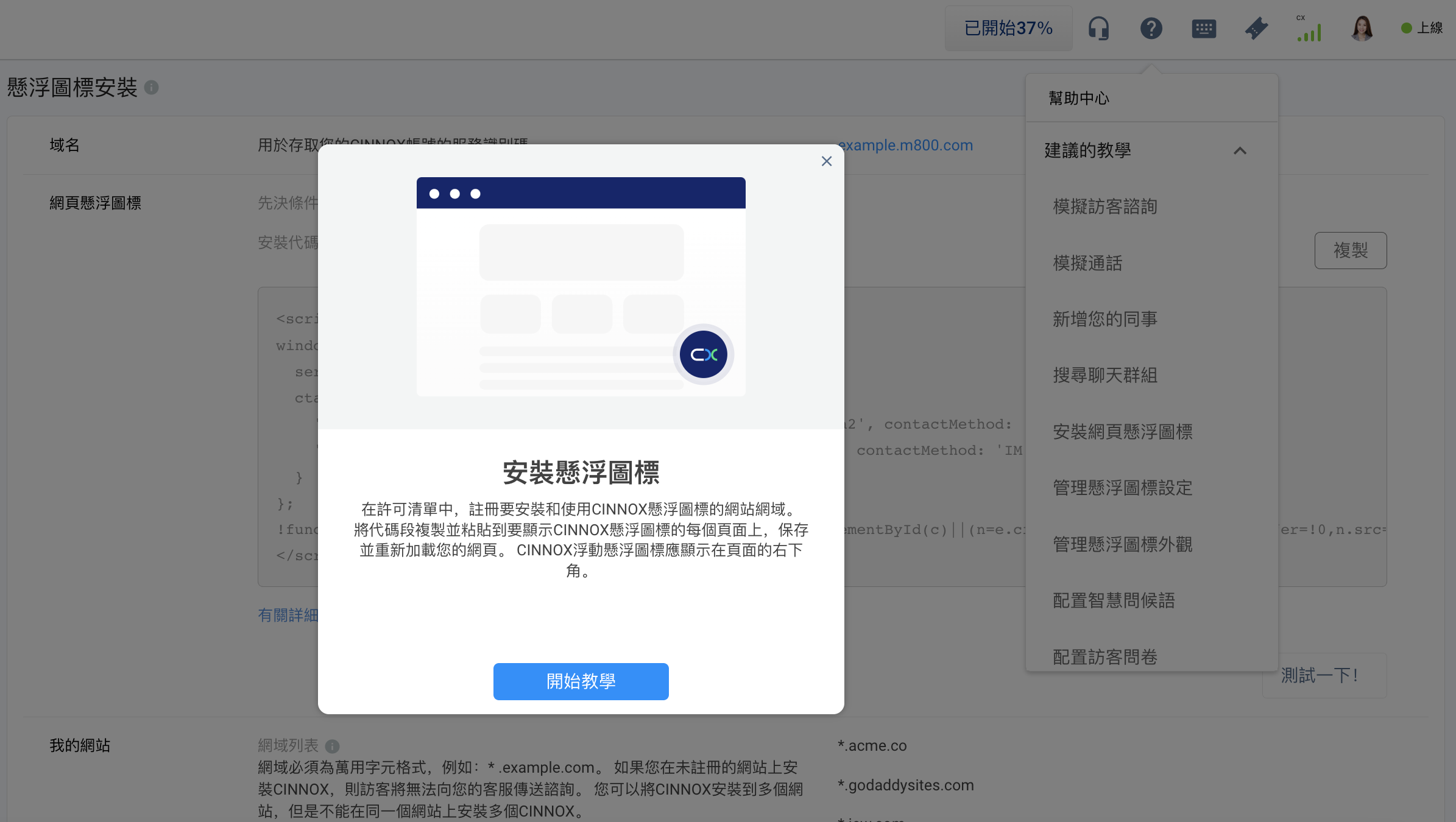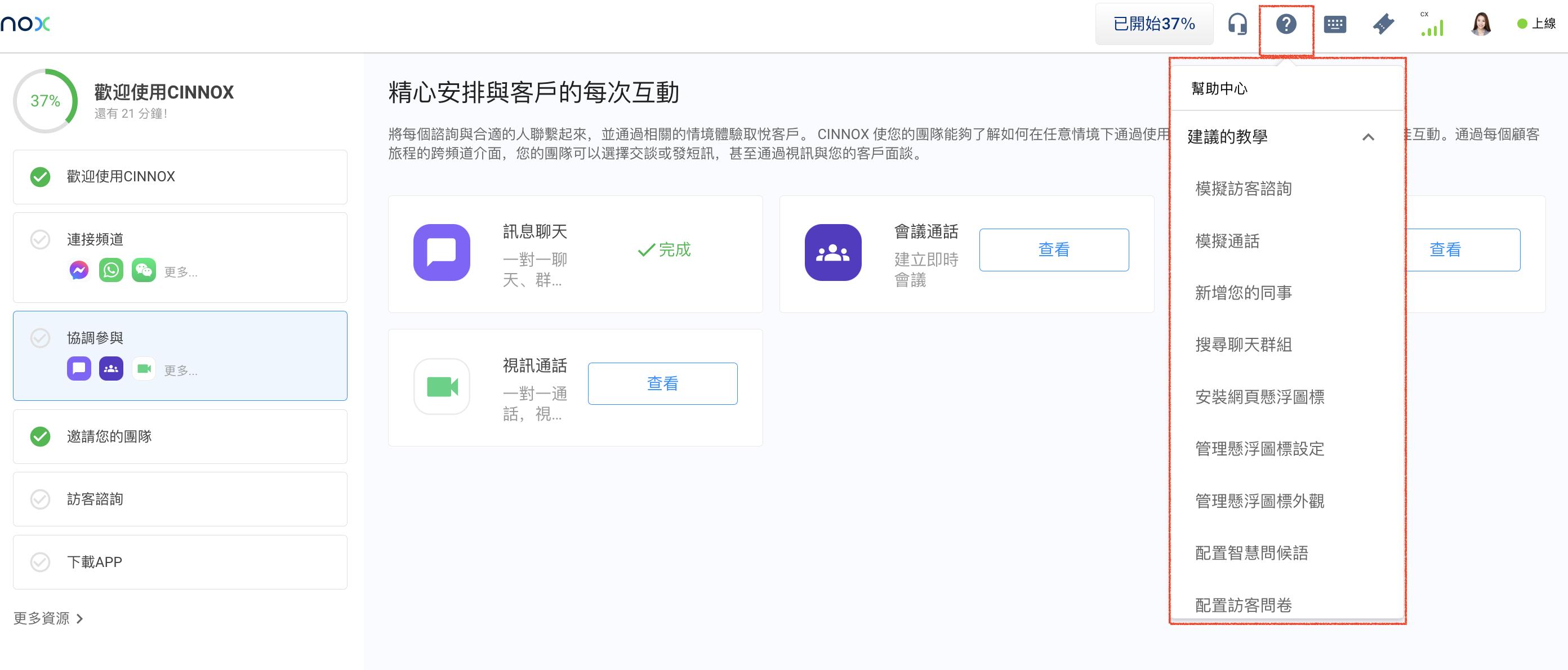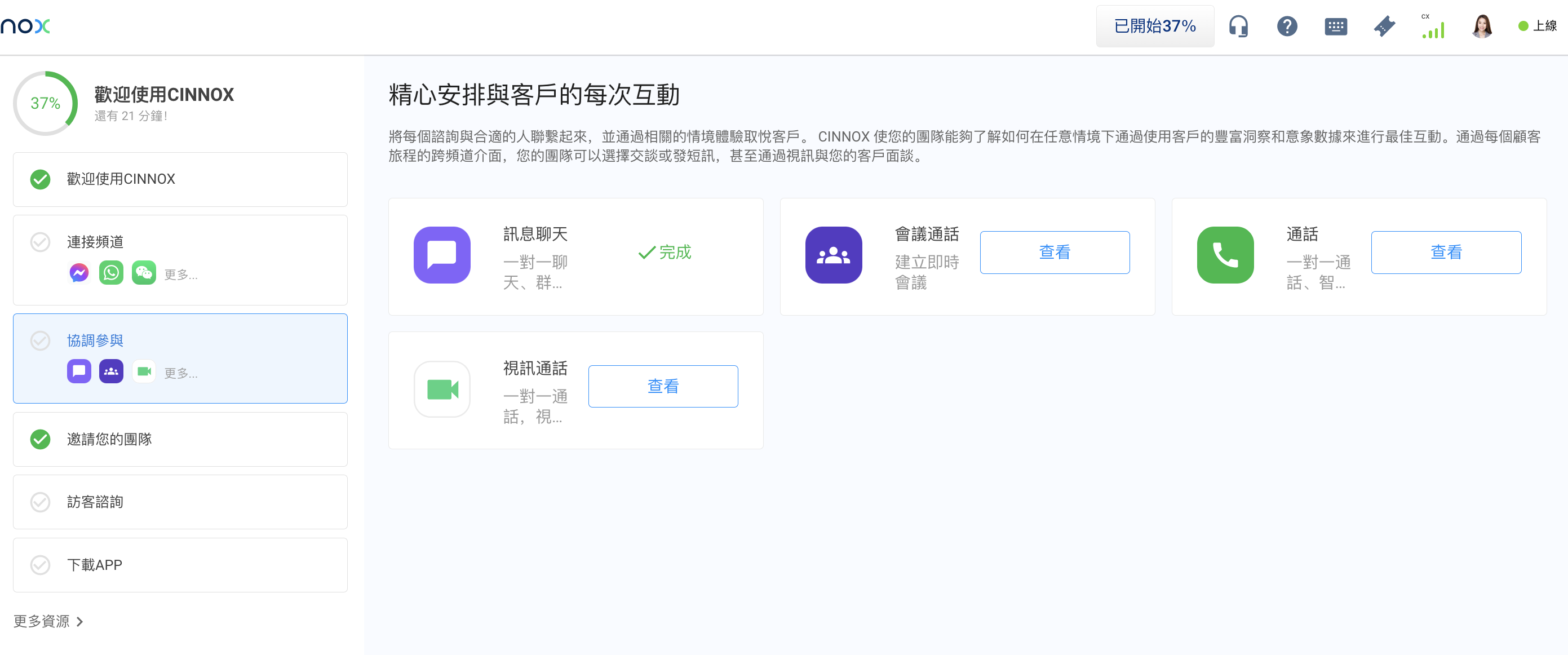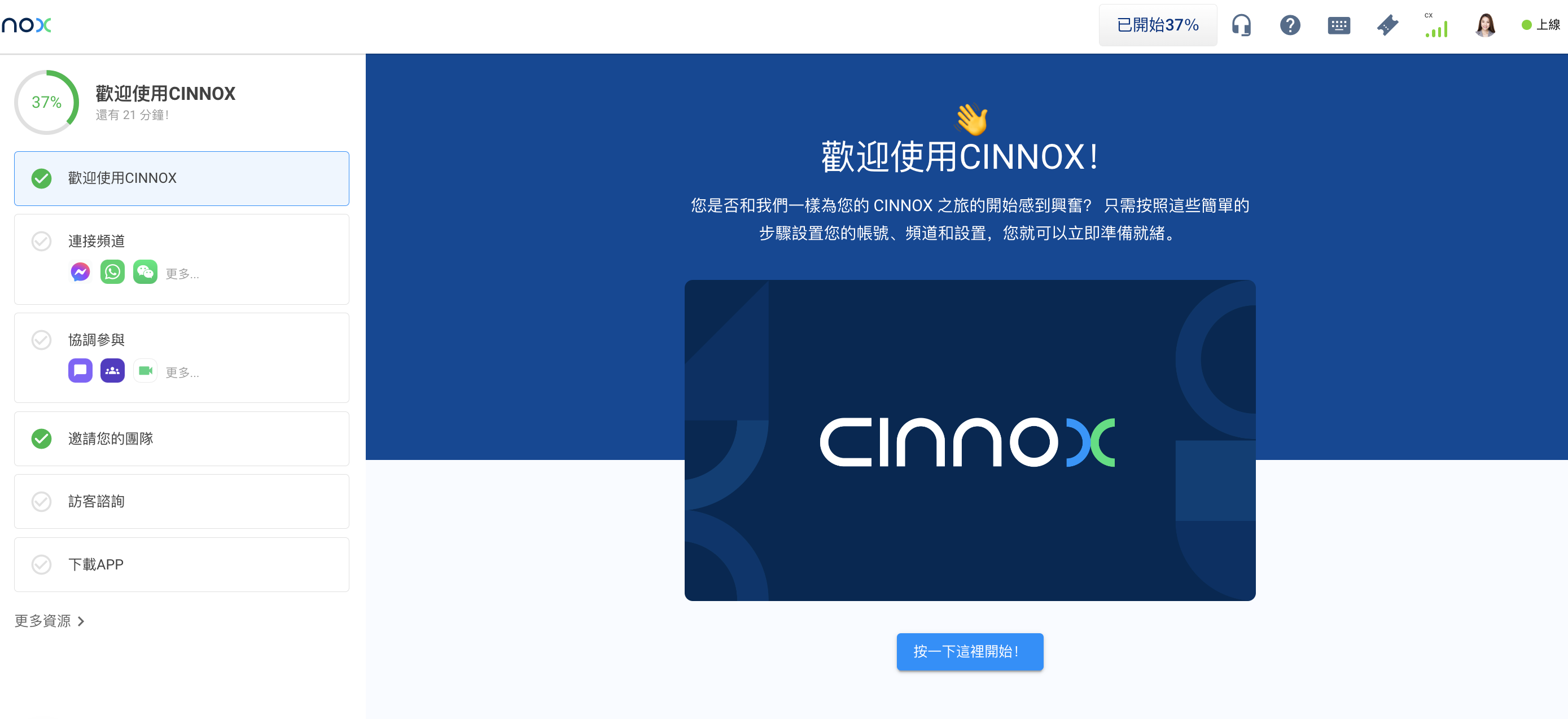 歡迎使用CINNOX的教學完成率以百份比表示,當完成一部份教學後,百份比增加,直到百份之百完成為止。