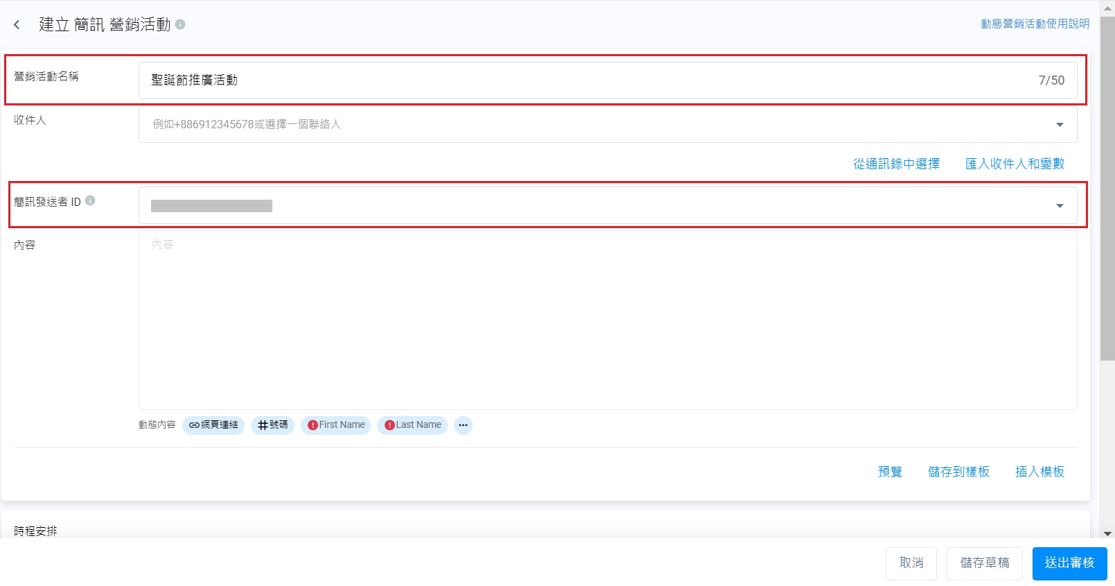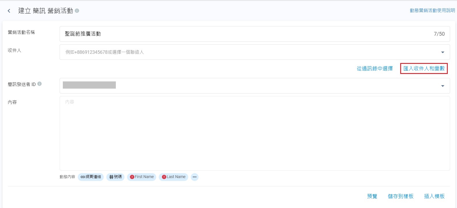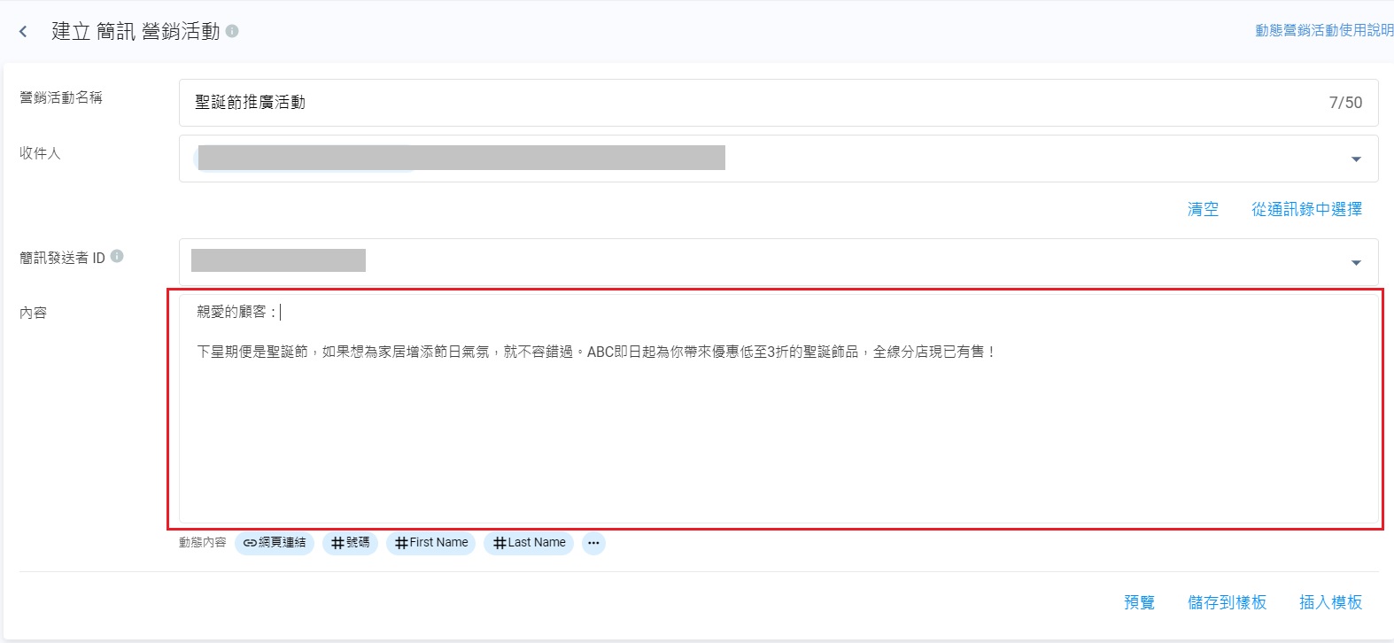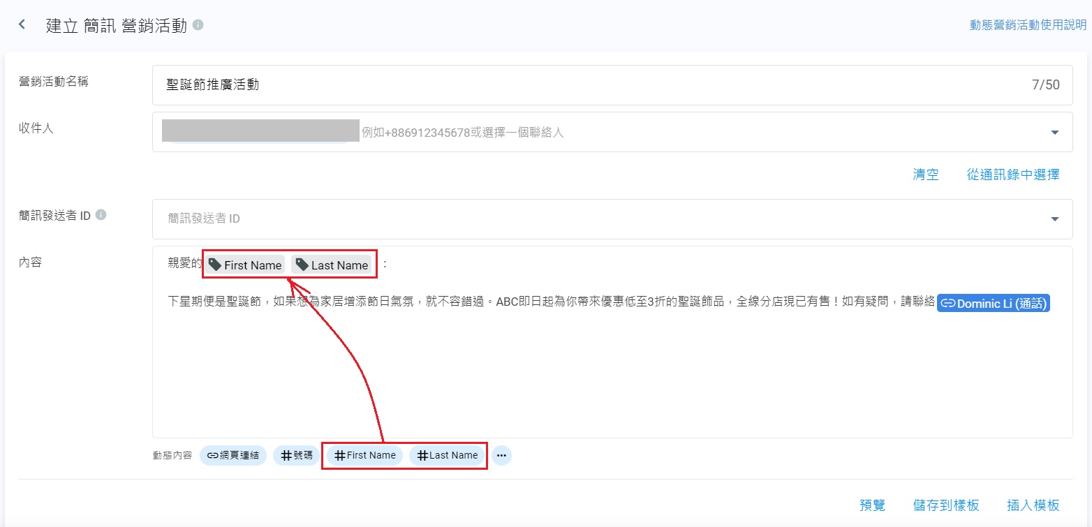 - 假如外部通訊錄紀錄了收件人的姓名, 在建立簡訊營銷活動頁面上,內容空格底下的動態內容,會顯示姓氏和名字。