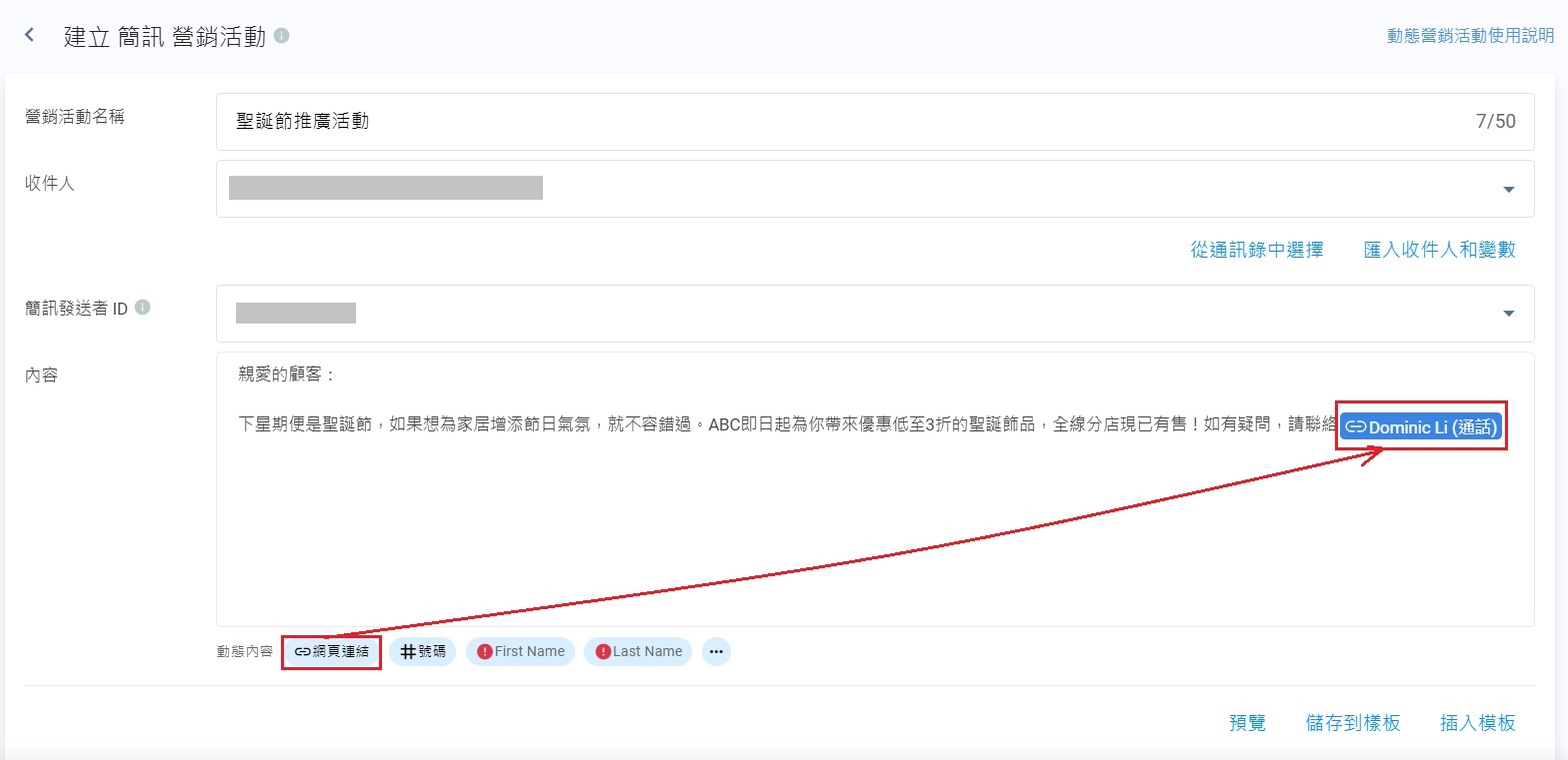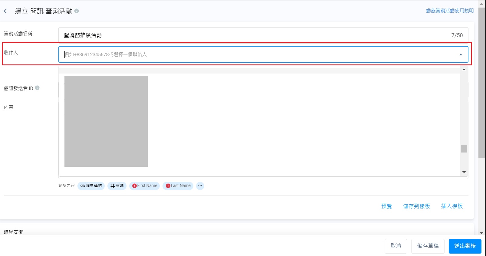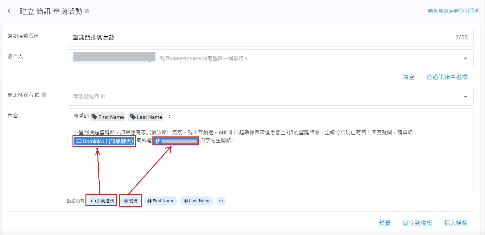 - 假如外部通訊錄紀錄了收件人的姓名, 在建立簡訊營銷活動頁面上,內容空格底下的動態內容,會顯示姓氏和名字。